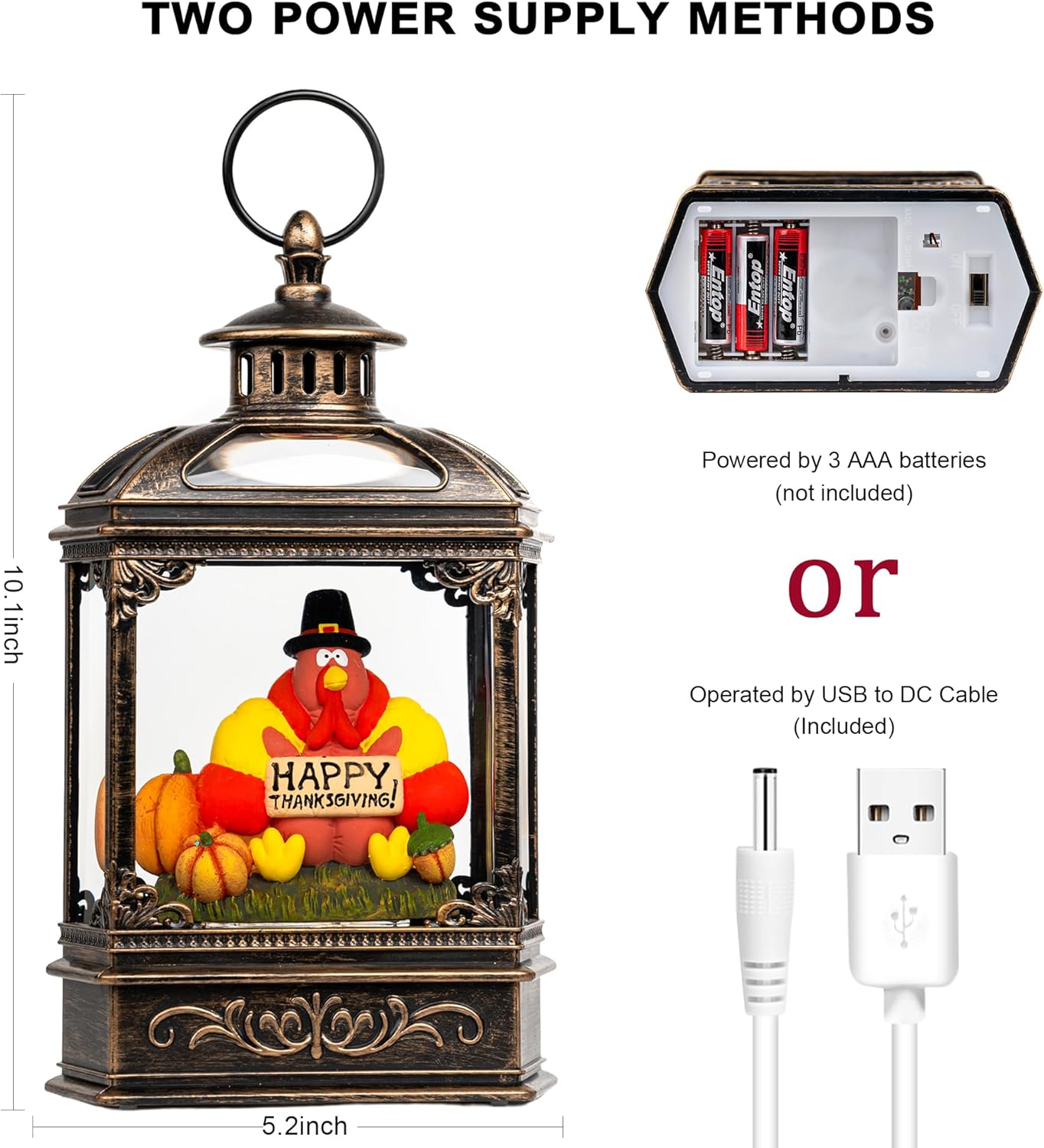- ๐ใ Thanksgiving Featureใ - When turned on, our bronze harvest lantern features a turkey wearing a pilgrim hat and holding a sign that reads โHappy Thanksgiving,โ pumpkins, and fall scenes inside. The warm LED shines on the figurines while the swirling glitter gives our harvest lantern a beautiful fall feel.