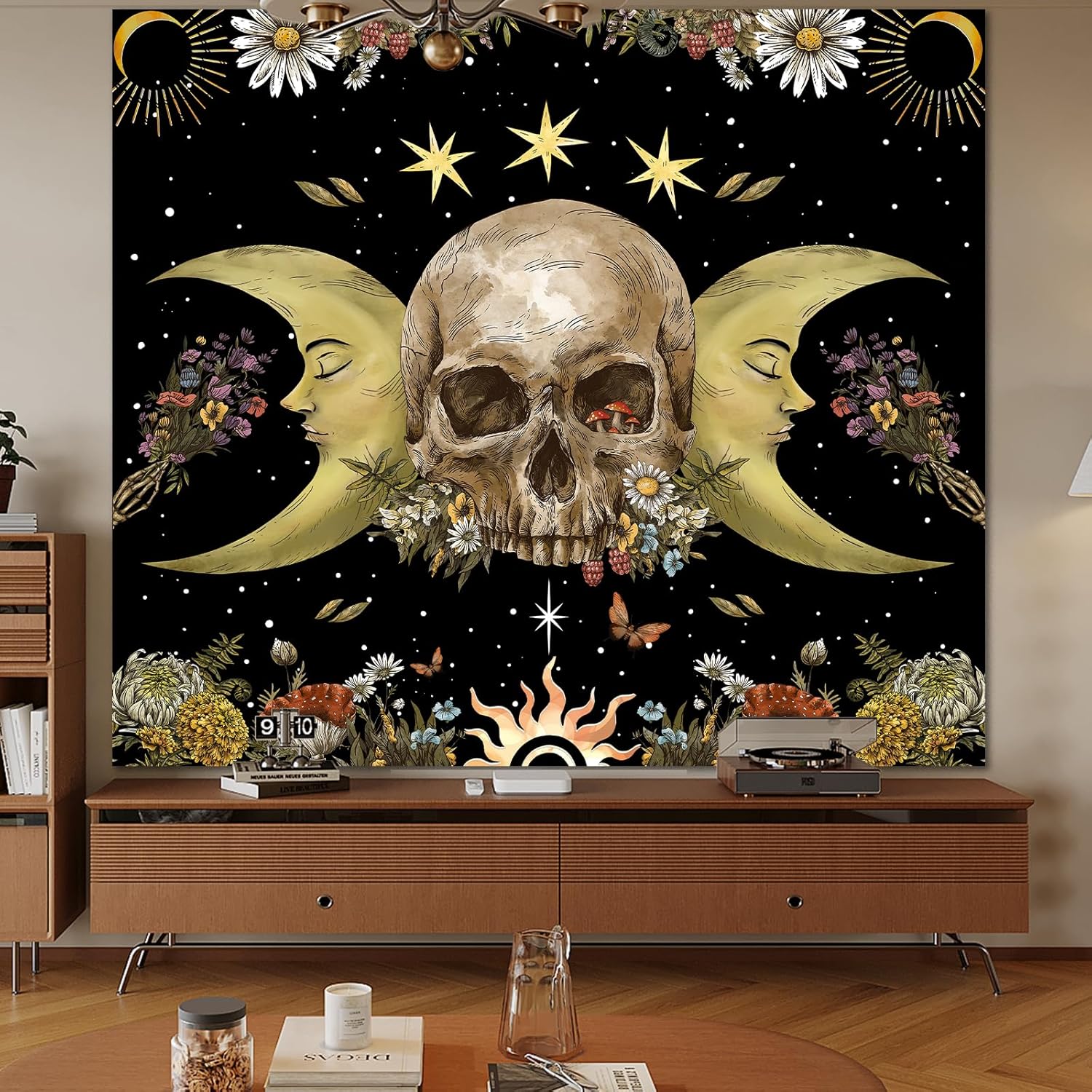 Atrippy Halloween Vintage Gothic Tapestry for Bedroom, Goth Skull Floral Wall Decor Tapestry, Sun and Moon Skeleton Flower Tapestries Aesthetic, Dark Room Decor Wall Hanging for Living Room Dorm 60x79 Inches