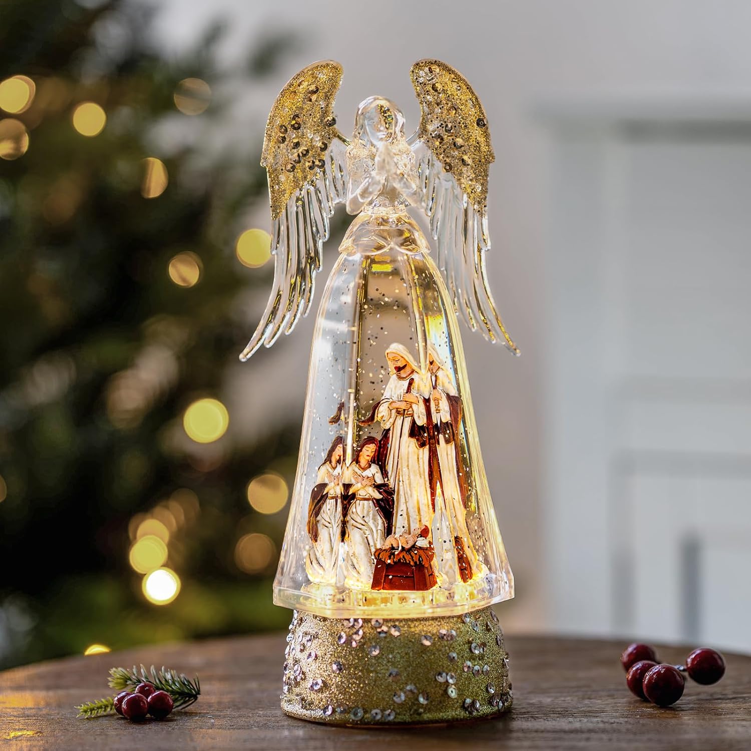 - 🪽【Lighted Angel Figurine】Crafted from acrylic with shimmering gold accents, this elegant Angel features praying hands and looking over the nativity scene. When turned on a warm LED shines on the figurine and swirling glitter to gives our Christmas globe a whimsical look for the Christmas Holiday season.