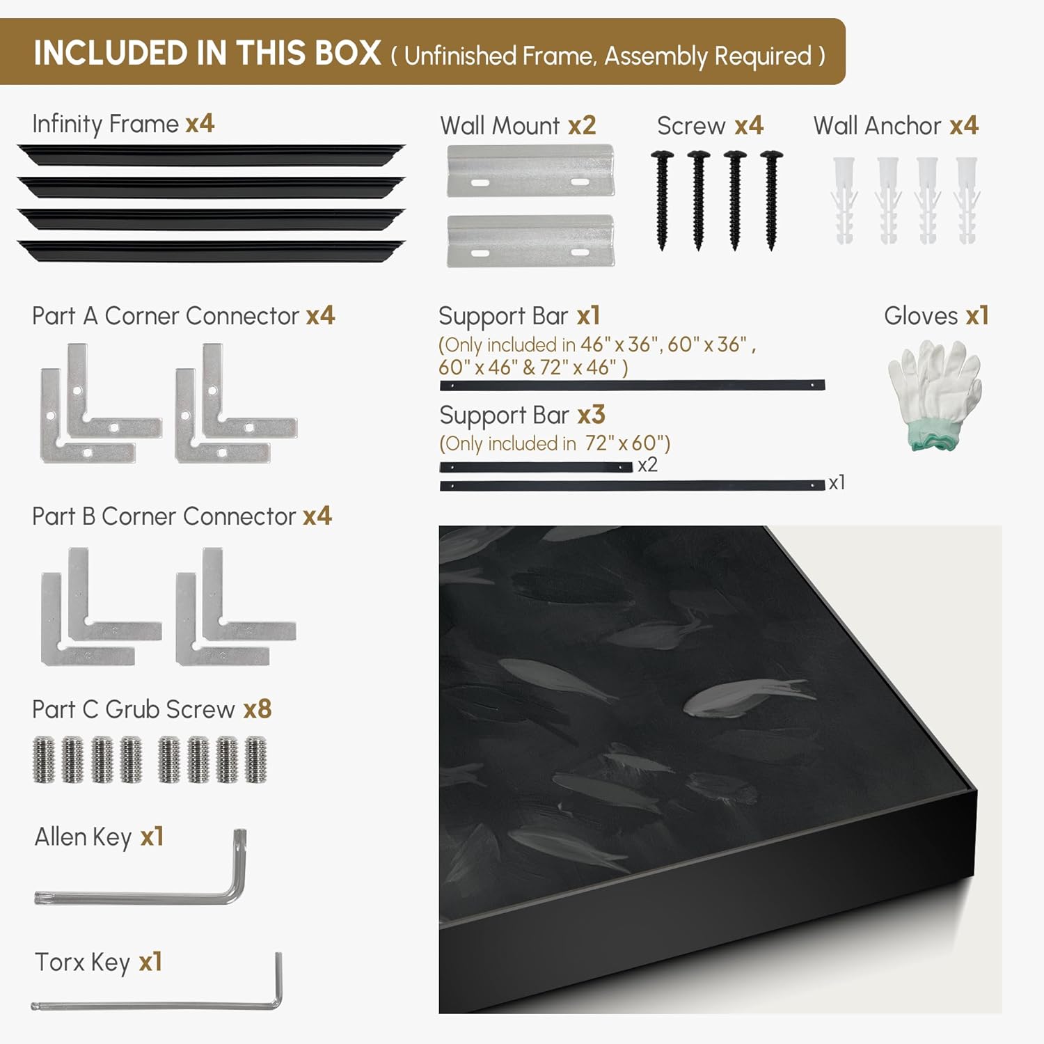 - Assembly Required: The artwork comes with the frame components unassembled. Don¡¯t worry - setup is straightforward and tool-friendly. For best results and accurate alignment, we recommend two people to ensure a smooth assembly and a stable, secure wall mount.