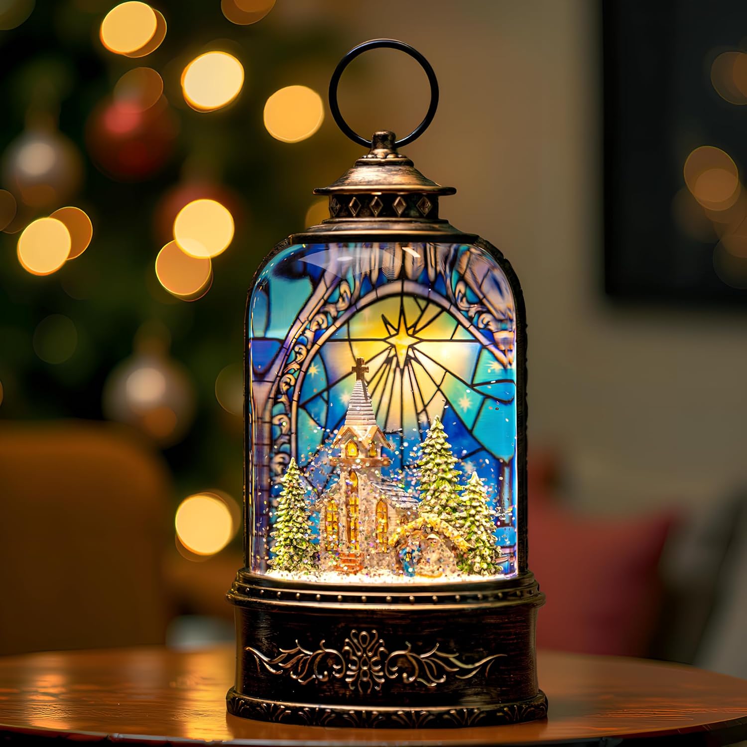 Christmas Snow Globe Lantern Water Glittering Churches & Holy Family with Music& Timer, USB Lined/Battery Operated Lighted Lantern for Christmas Festival Decoration Gifts