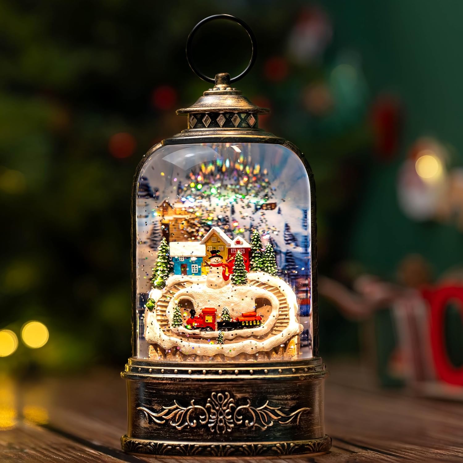 Christmas Snow Globe Lantern Water Glittering Snowman & Train with Music & Timer, USB Lined/Battery Operated Lighted Lantern for Christmas Festival Decoration Gifts