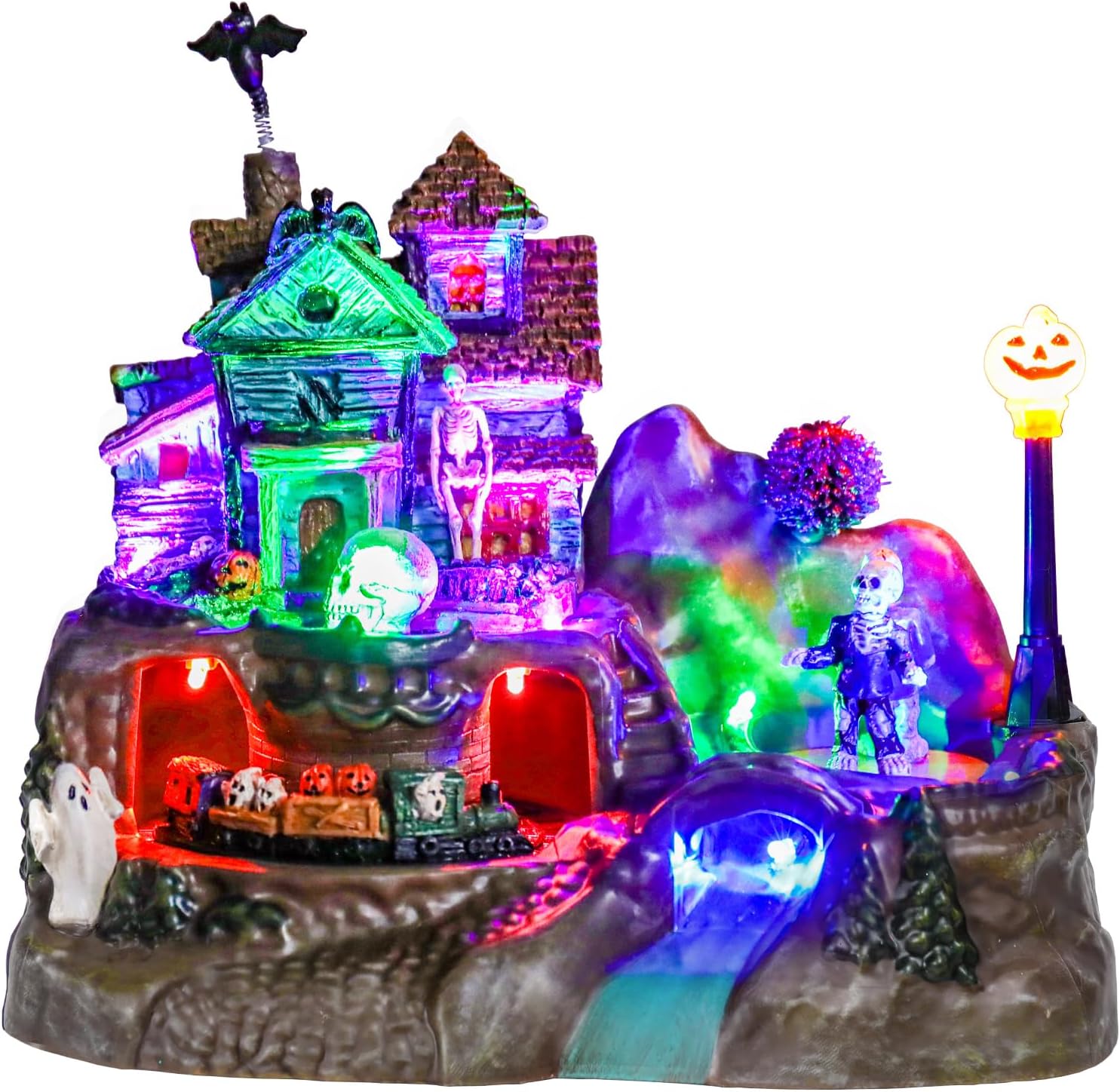 - Halloween Village House: Lighted spooky haunted house with animated train, skull, pumpkin and ghosts, stands out in Halloween display and is perfect for creating a spooky atmosphere for your Halloween decorations