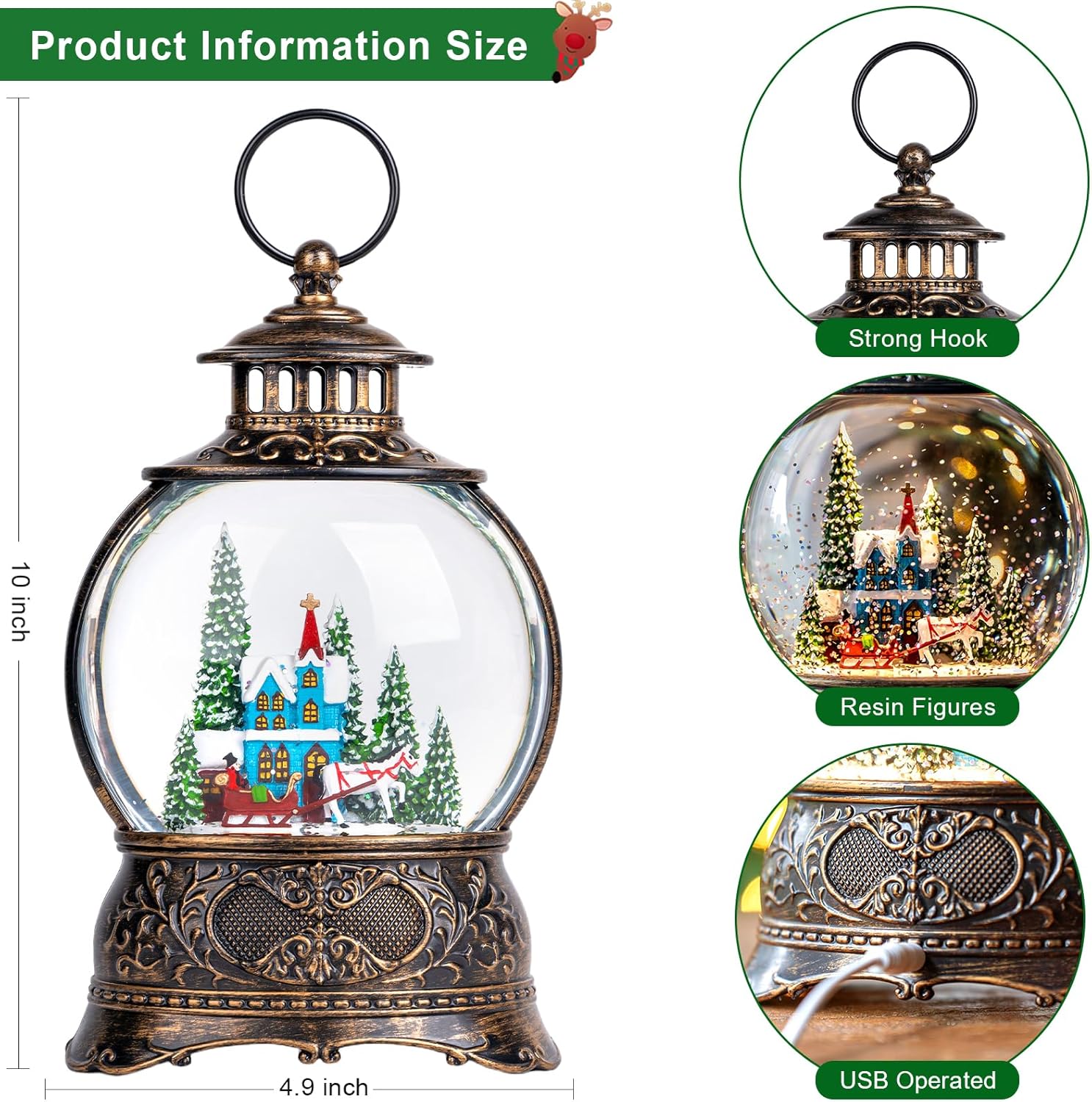 - ๐๐ ใ Battery & USB ใThe christmas snow globe comes with the USB,you can charge by USB. It is also powered by 3 AA batteries (Not Included). It allows you to put it wherever you want to decorate, indoors or outdoors. This snowglobes christmas lantern is flexible and convenient,Don't worry about finding a power outlet.