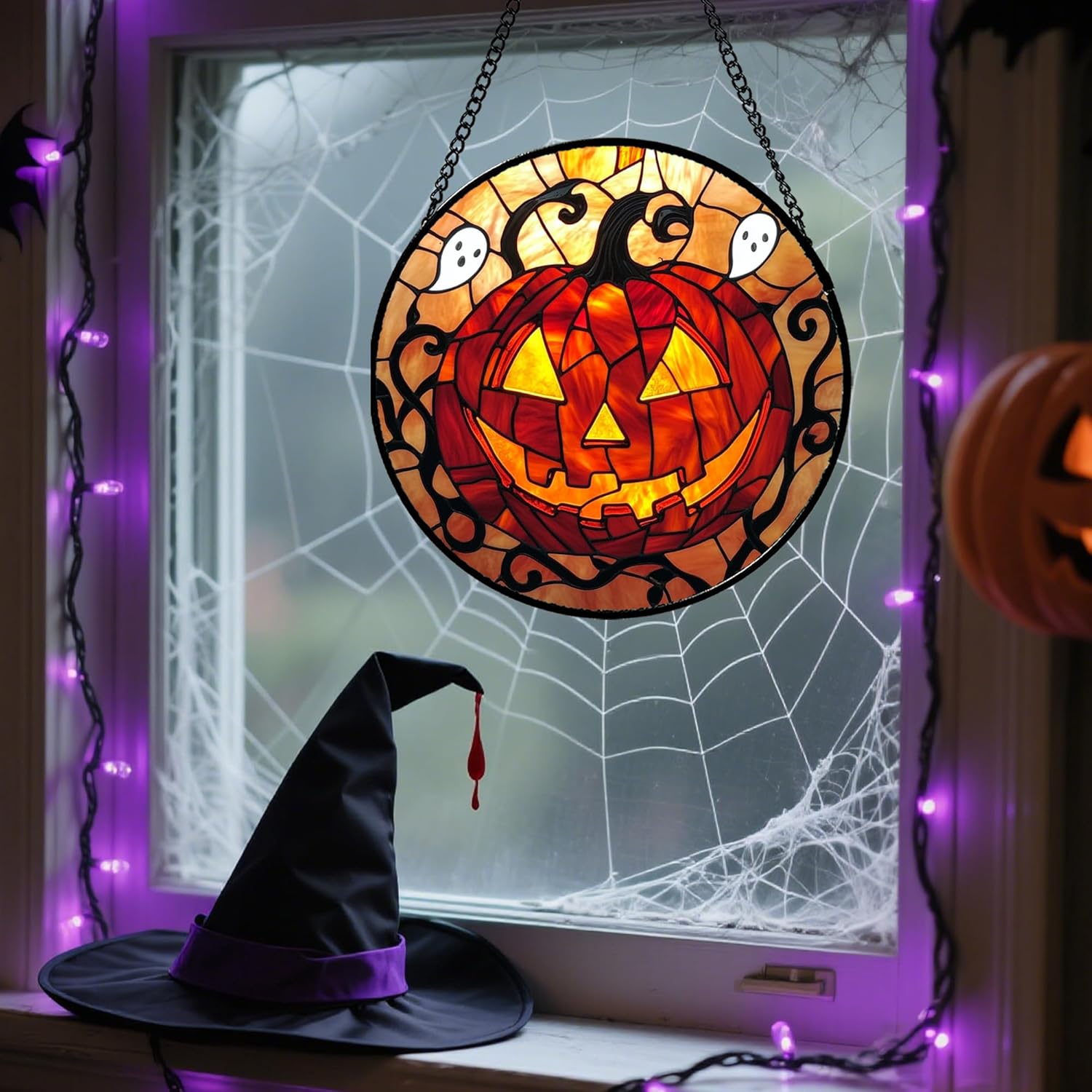 Stained Glass Window Hanging - Halloween Decorations Evil Pumpkin Orange Suncatcher for Doors Garden Indoor Funny Spooky Sun Catchers Gothic Decor Horror Gifts for Women Men Friend 7.8 in