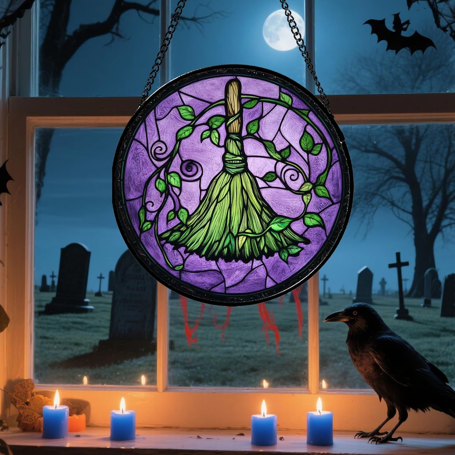 Stained Glass Window Hanging - Halloween Decorations Witch Magic Broom Suncatcher for Doors Garden Indoor Funny Spooky Sun Catchers Gothic Decor Horror Gifts for Women Men Friend 9.8 in