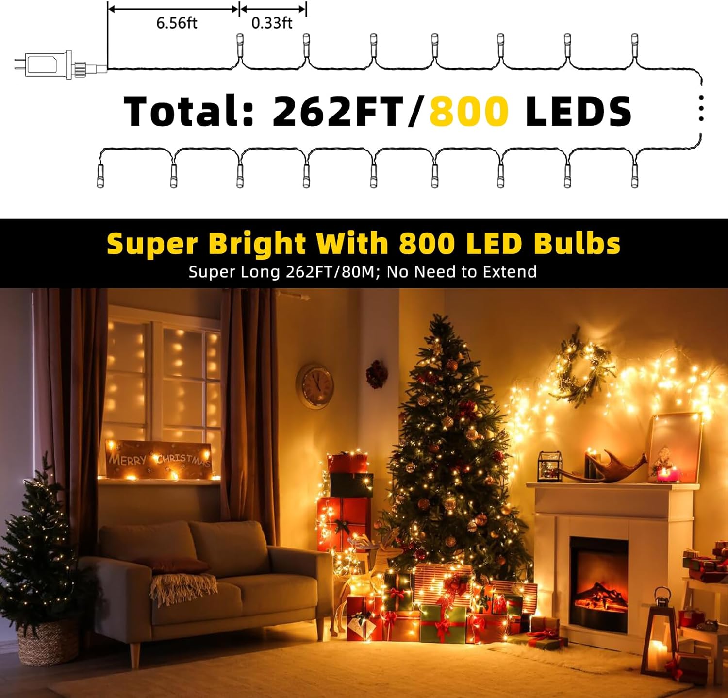 - Long Length & End to End Expandable:Longer wire + more LEDs. This super long 262ft fairy string lights with 800 warm white individual LED bulbs. The ample length makes it easy to decorate Christmas trees, Christmas houses, eaves, and yards. They will brighten up the dark corner for happiness atmosphere inside or outside.