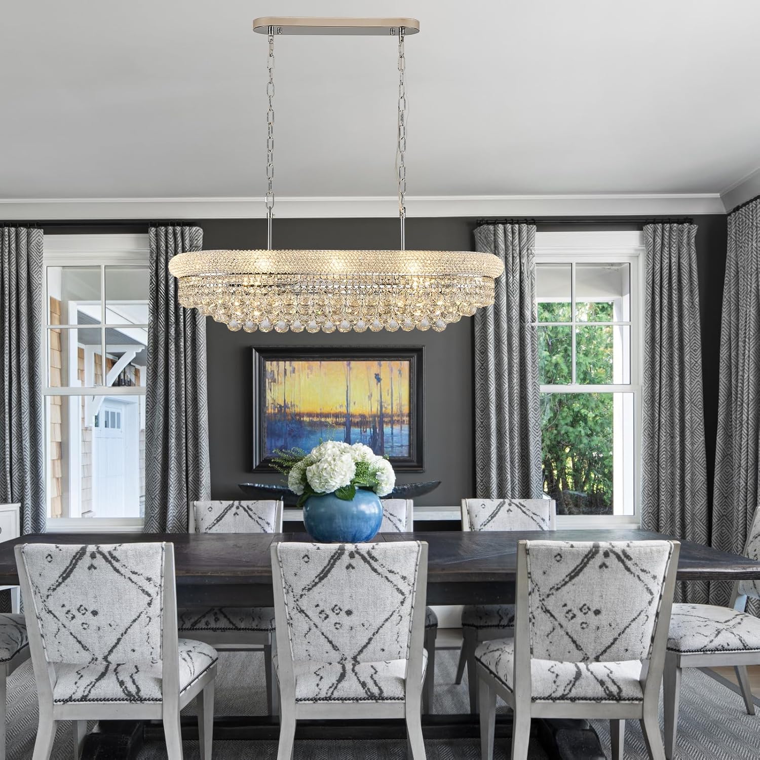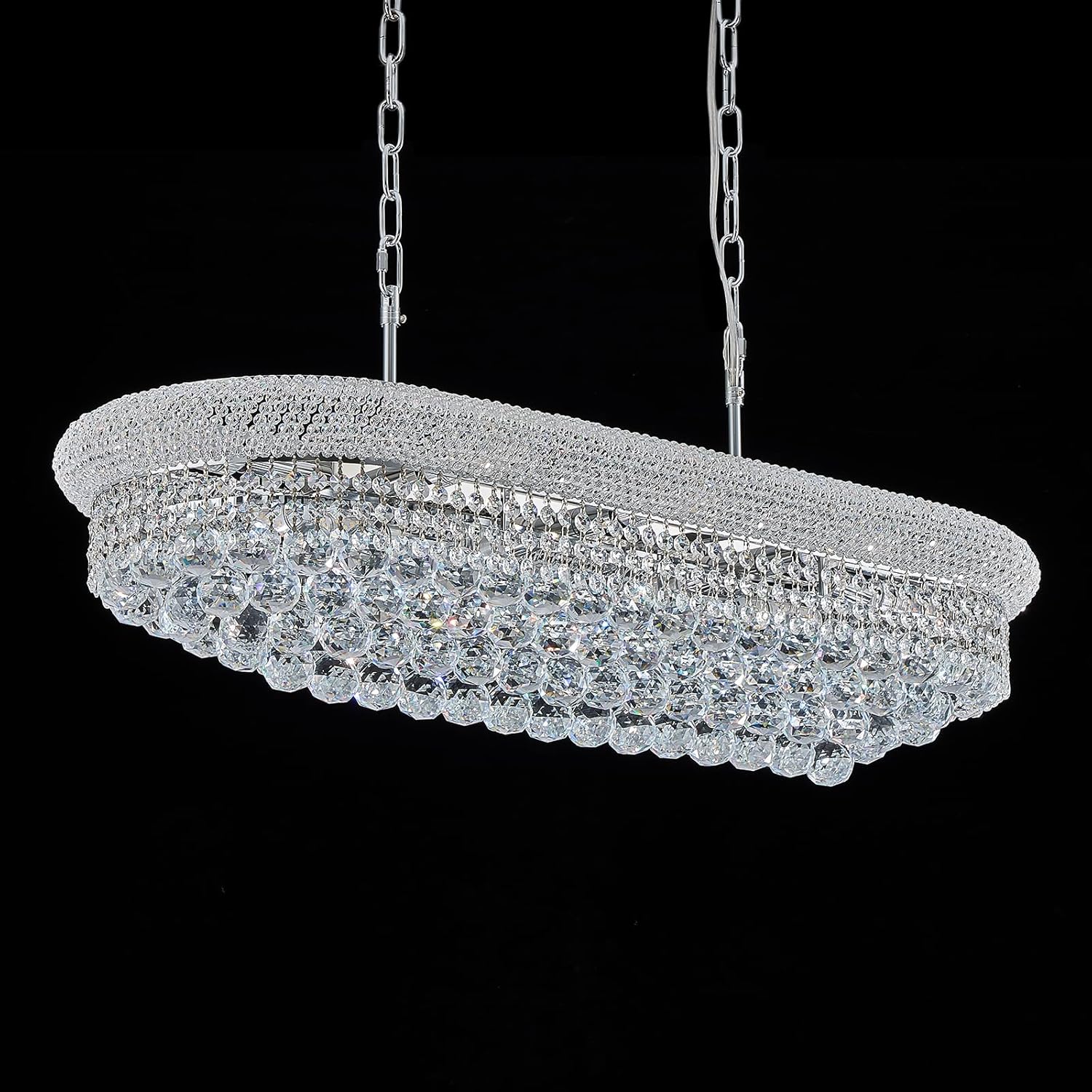Rectangular Crystal Chandeliers for Dining Room,10 Lights Adjustable Height Oval Crystal Ceiling Light Fixture for Kitchen Island, Chrome Finish, L36''