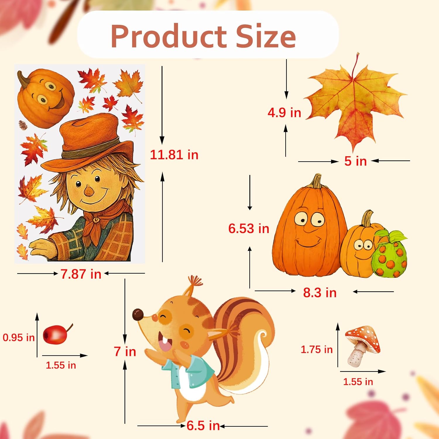 - ๐What you will get: you will get 12 sheets fall themed static window clings, totally 153 pcs parts of autumn window stickers. 11.87*7.87 inch every sheets, and different size of every part. There are large size pumpkin, scarecrow, truck, maple leaves and tree, fox, squirrel, etc.