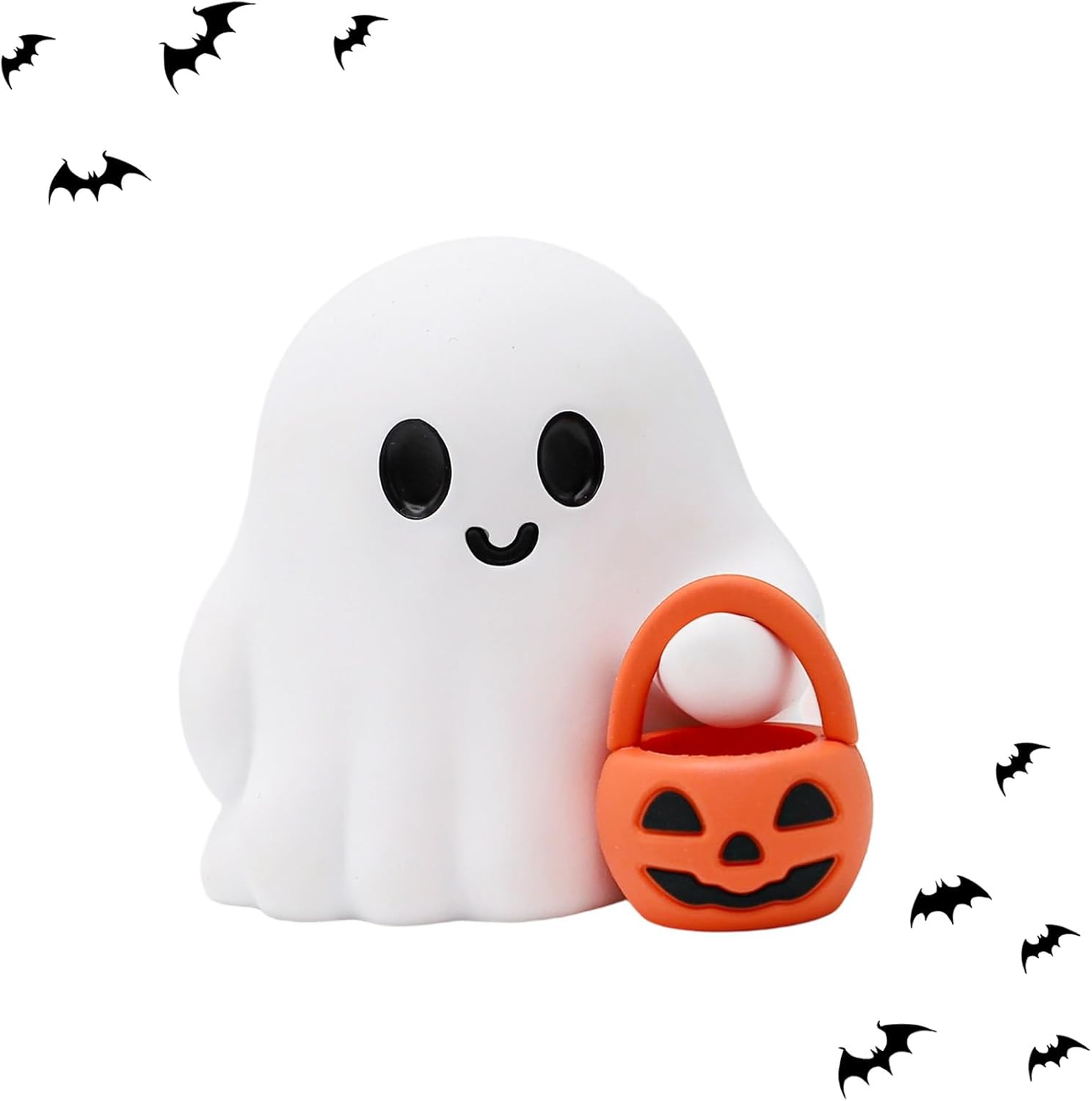 Halloween Ghost Figurine Cartoon Cute Spooky Carrying Pumpkin Basket Desk Display Ornament Tiny Trick or Treat Ghost Resin Halloween Statue for Home and Office Tabletop Decor Supplies
