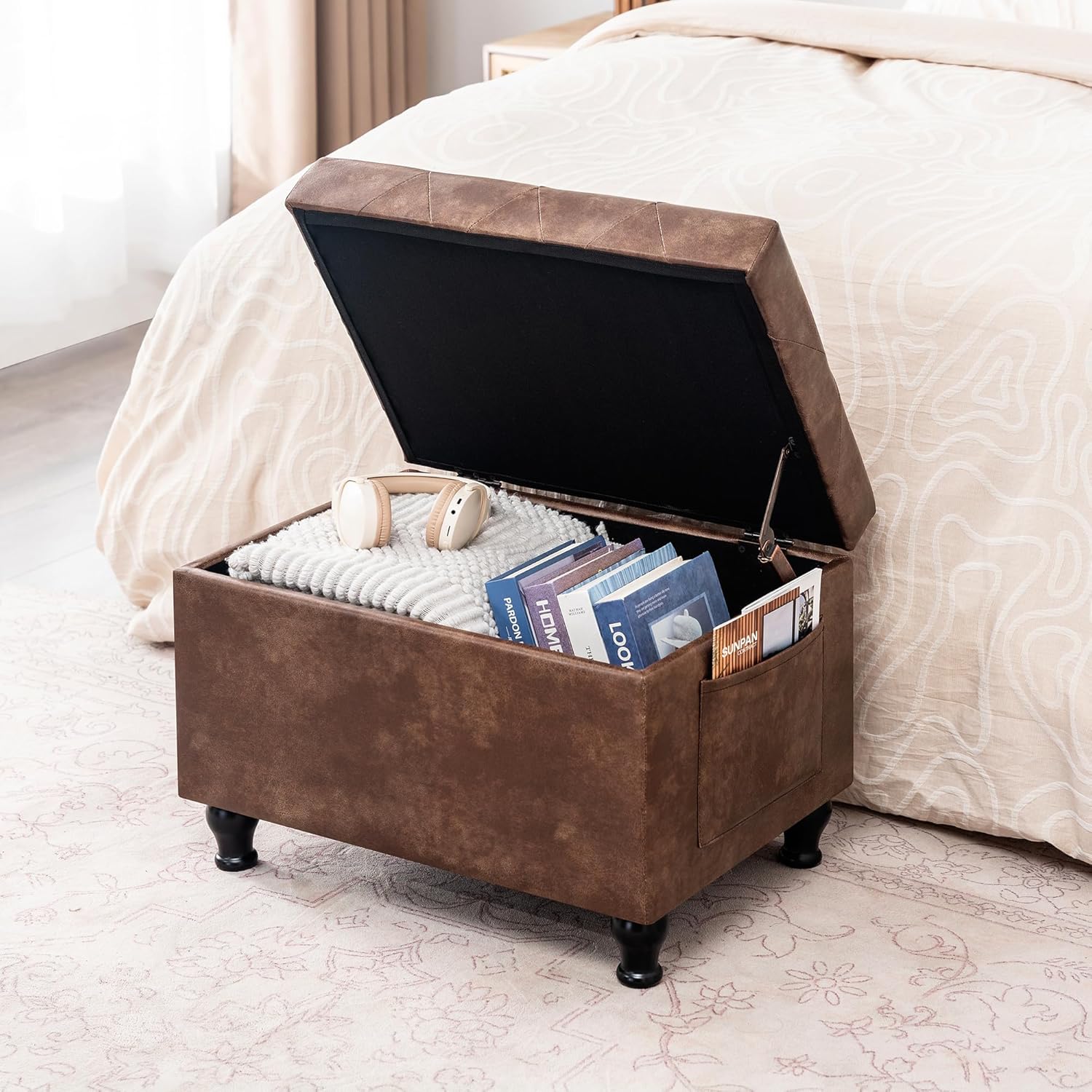 - 【Storage Ottomans】– The 24 inch square ottoman with storage offers generous storage capacity, perfect for stashing blankets,pillows, books, game controllers and other leisure and entertainment items . The smooth, hinged top lifts effortlessly, while the built-in side pocket adds quick-access storage for remotes, magazines, or small essentials.