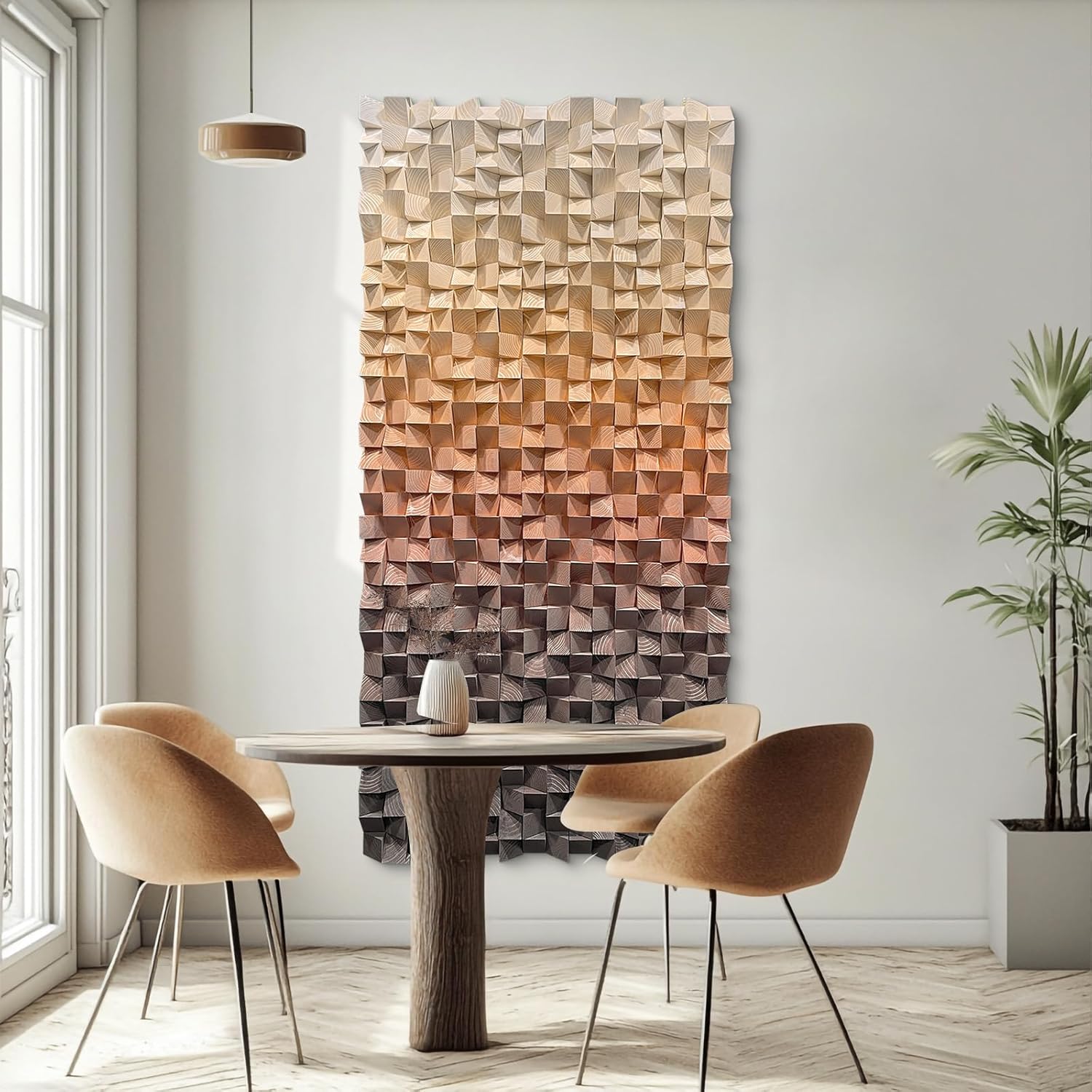 - Stunning visual effect: This decorative wall panel is 23.6 inches long and 47.2 inches high, pieced together with unique triangular pine blocks, presenting a highly artistic three-dimensional texture. In terms of color, it gradually transitions from light beige to warm orange brown, and then to deep gray black, like a naturally drawn oil painting, adding unique visual charm and artistic atmosphere to the space.