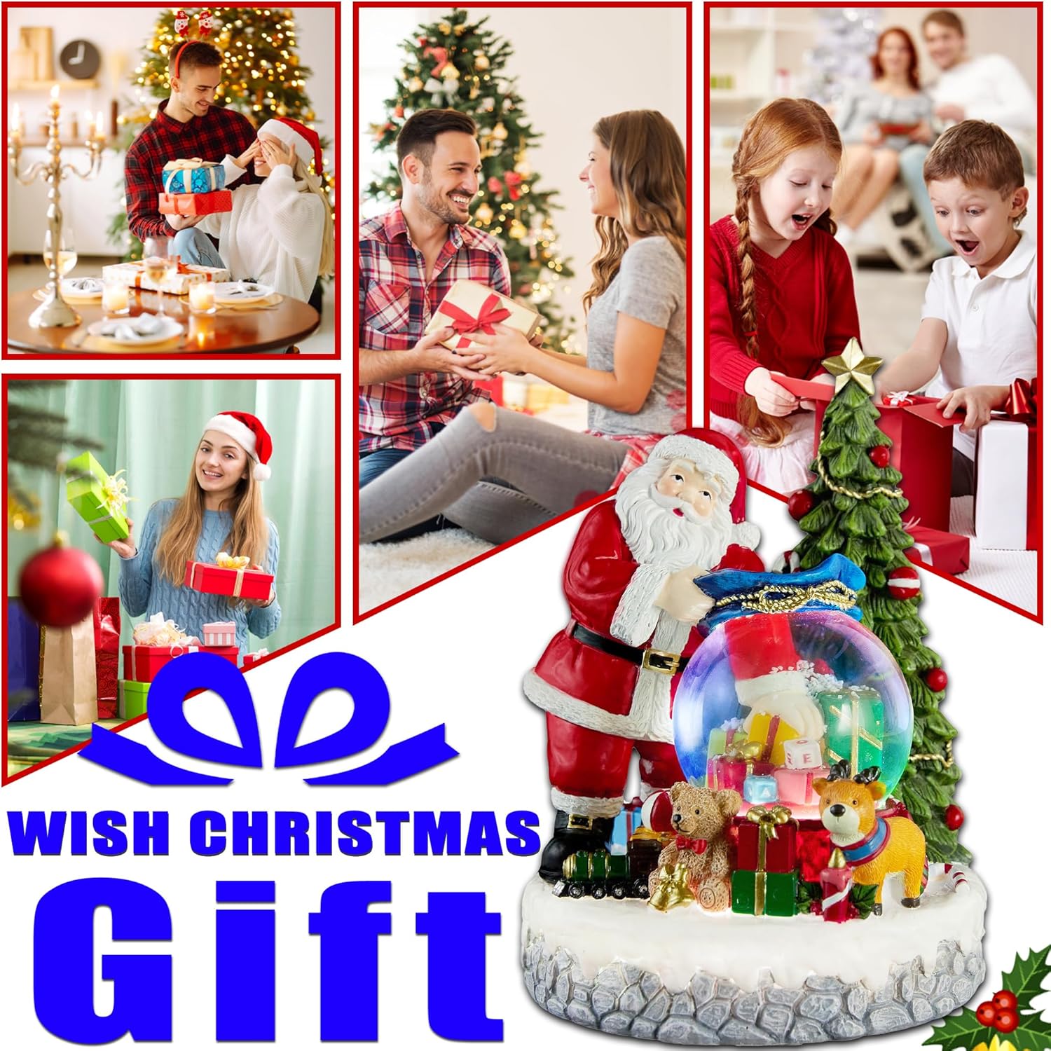 - ๐โ๏ธใ Exclusive Design ใThis Christmas tree is made of high-quality resin materials and exquisitely crafted. It features rich Christmas elements such as Santa Claus holding gifts, reindeer, Christmas trees, teddy bears, and bells. In the middle is a crystal-clear snowflake glass ball with a pile of glittering gifts inside. This is a unique product in the market. The snow globe has two modes: when the switch is turned on, mode one is "light on". After clicking the switch, Mode Two is "Light on + Music".