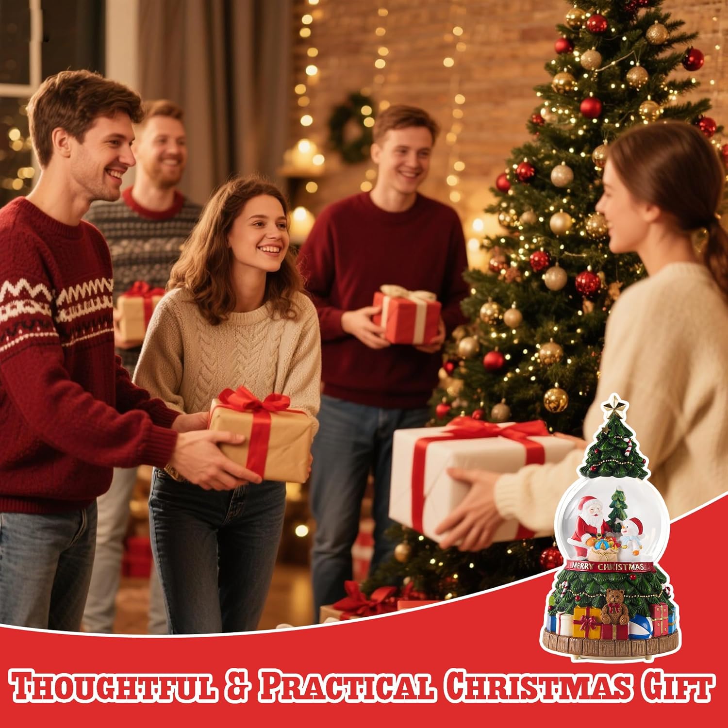 - ๐โ๏ธใ Exclusive Design ใCrafted from premium resin, this exquisitely designed Christmas tree features intricate carvings of festive elements (gifts, candies, teddy bears) around both the tree and its base. The snow globe interior showcases a unique Christmas scene with Santa Claus and a snowman exchanging gifts โ a truly one-of-a-kind product on the market. Two Modes "Turn on the switch for Mode 1: Lights + Music. Press the switch again for Mode 2: Lights Only."