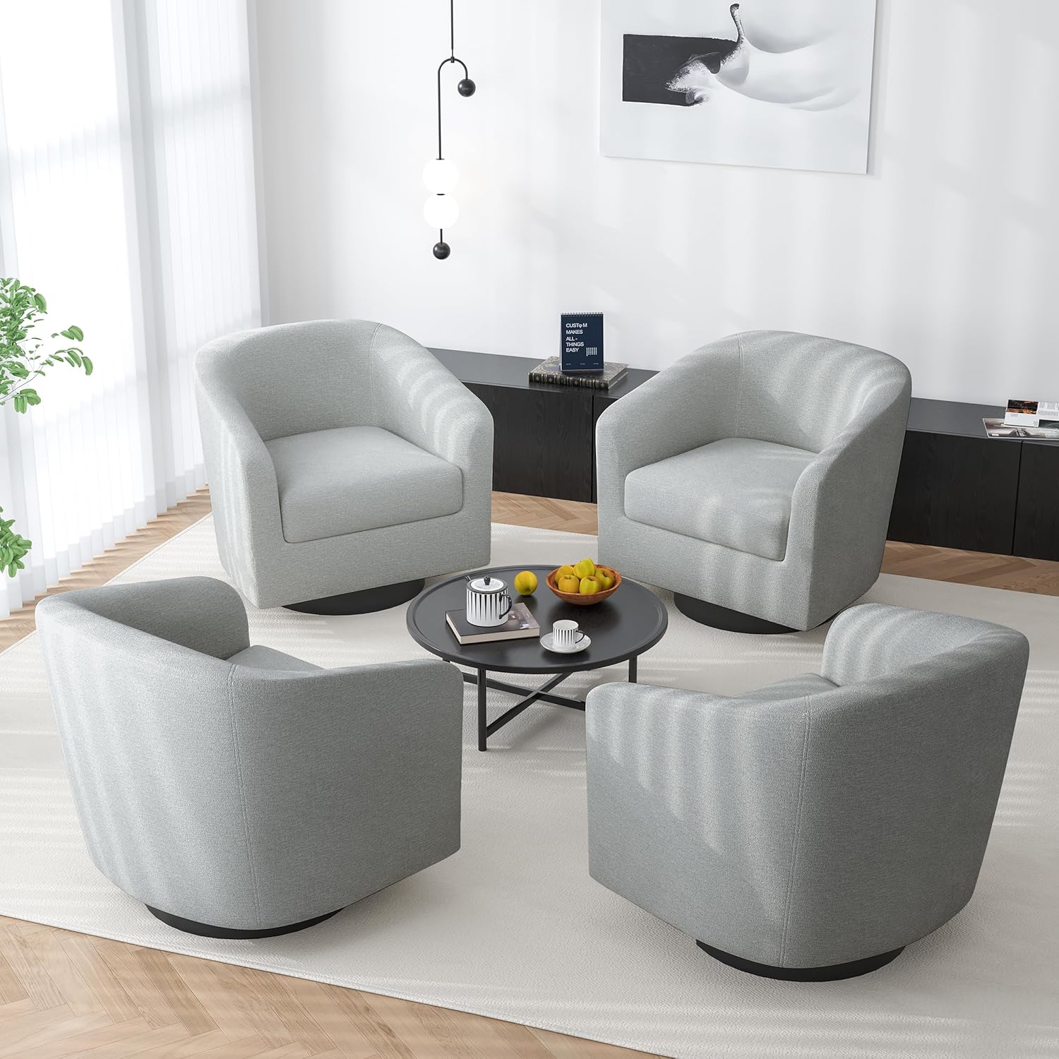 Swivel Barrel Accent Chair, Modern Round Chenille Fabric Arm Chair for Living Room, Bedroom, Comfy Club Reading Chairs for Adults(Chenille Fabric, Light Grey, Set of 4