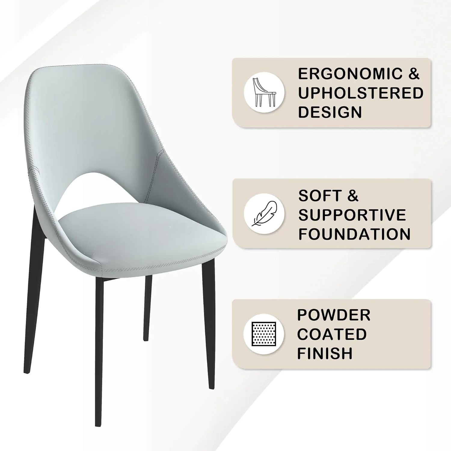 - Relax in luxurious comfort with our modern dining chair, featuring a premium foam-filled seat for supreme comfort during extended periods of sitting. Whether you're dining, conversing, or simply unwinding, you can enjoy unparalleled comfort in style. The solid back design adds elegance and provides support, while the open back promotes breathability, making the Amalfi modern accent chair ideal for any occasion.