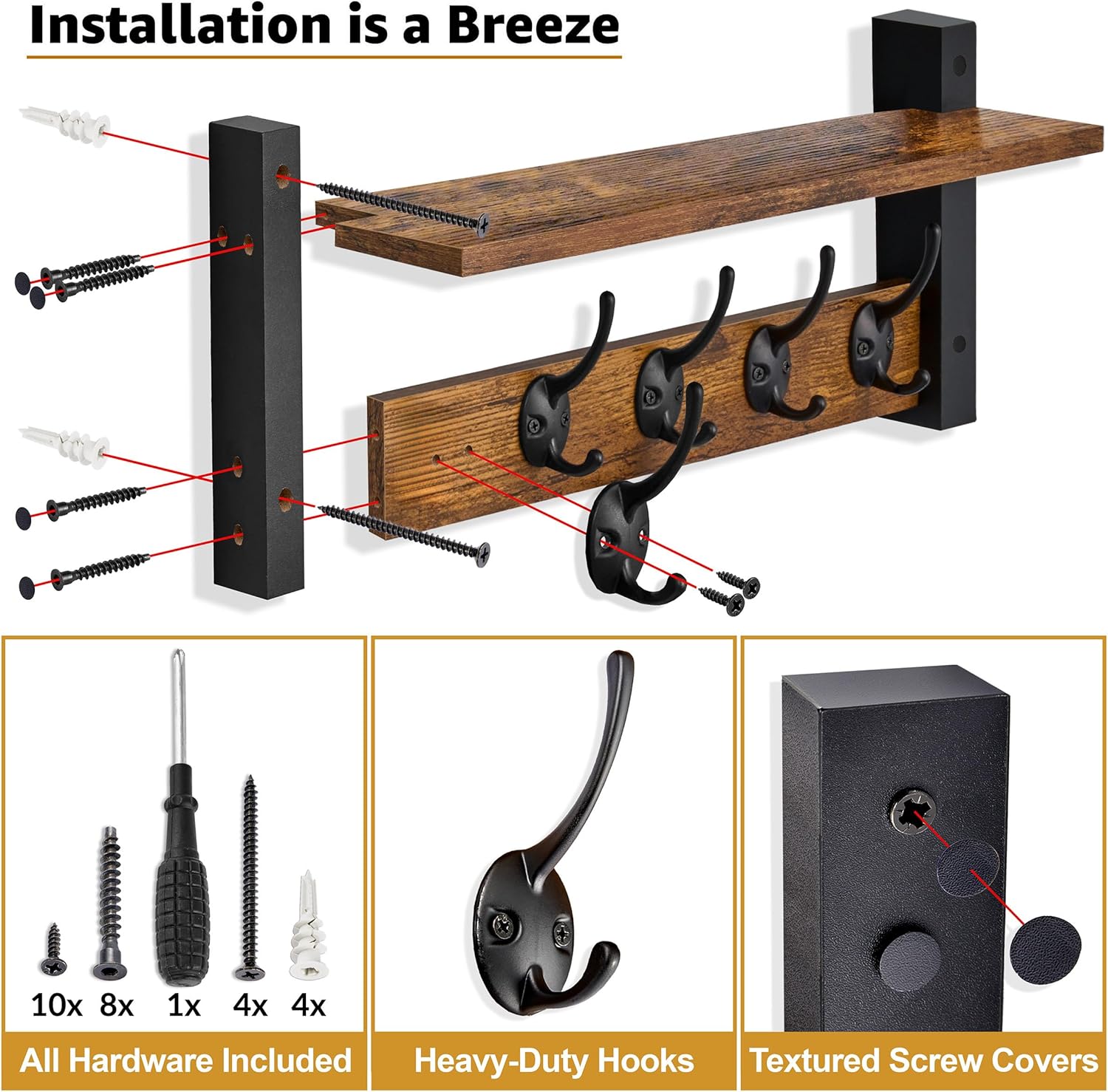 - Easy Installation, All Hardware Included – Labeled parts and step-by-step instructions make installation a breeze. Comes with screws, drywall anchors, mini level, screwdriver, and textured screw covering stickers for a clean finish. Measures approximately 15.75 L x 7.5 W x 4.7 D.