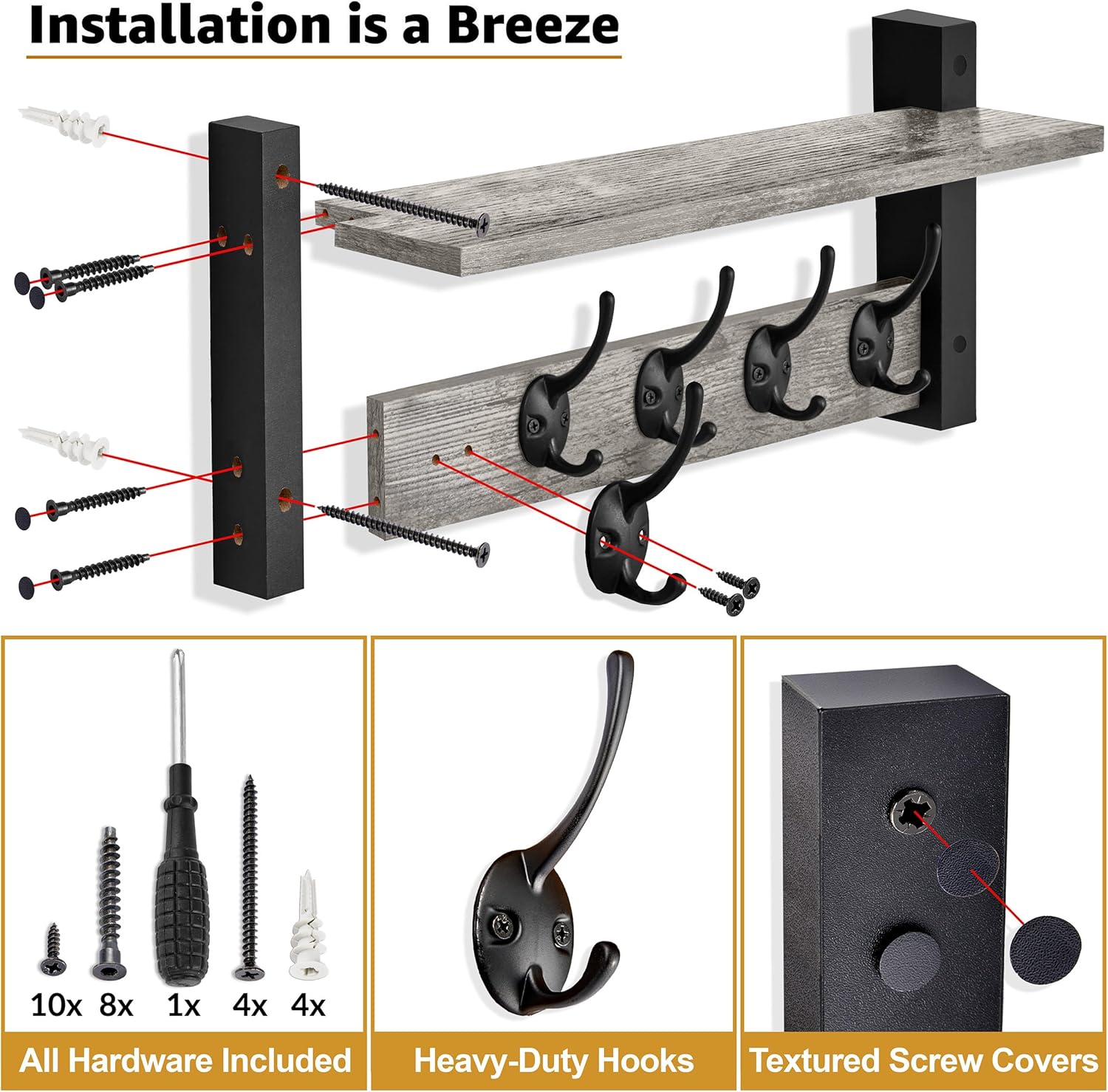 - Easy Installation, All Hardware Included – Labeled parts and step-by-step instructions make installation a breeze. Comes with screws, drywall anchors, mini level, screwdriver, and textured screw covering stickers for a clean finish. Measures approximately 15.75 L x 7.5 W x 4.7 D.