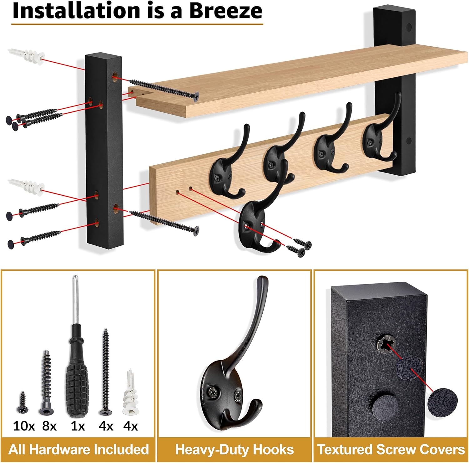 - Heavy-Duty Metal Hooks – The Shelf is made of beautiful engineered faux wood (not solid wood) featuring a smooth matte finish. Equipped with 5 metal sturdy dual hooks, our wall mount coat rack holds everything from coats to backpacks to bathrobes – built to last and resist bending, cracking, or slipping.