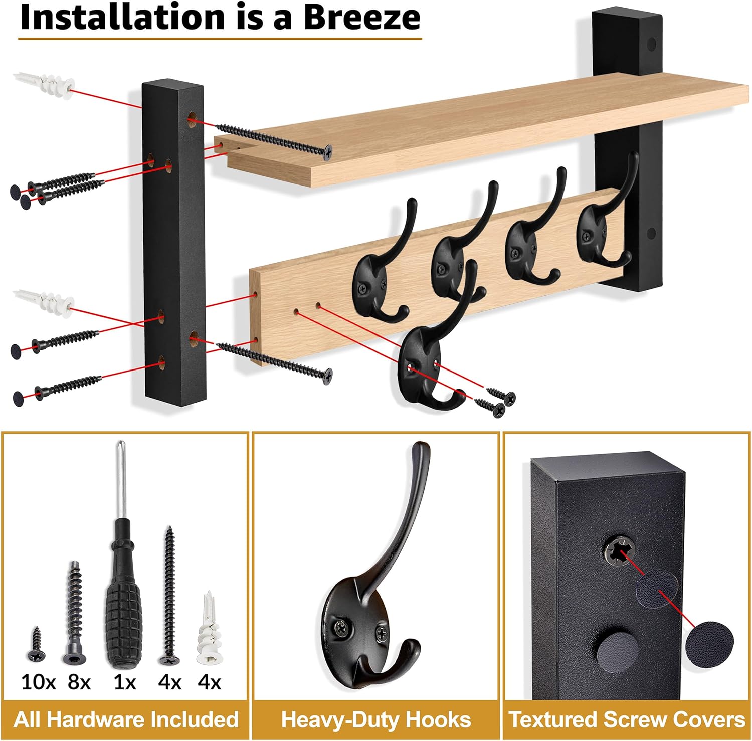 - Heavy-Duty Metal Hooks – The Shelf is made of beautiful engineered faux wood (not solid wood) featuring a smooth matte finish. Equipped with 5 metal sturdy dual hooks, our wall mount coat rack holds everything from coats to backpacks to bathrobes – built to last and resist bending, cracking, or slipping.