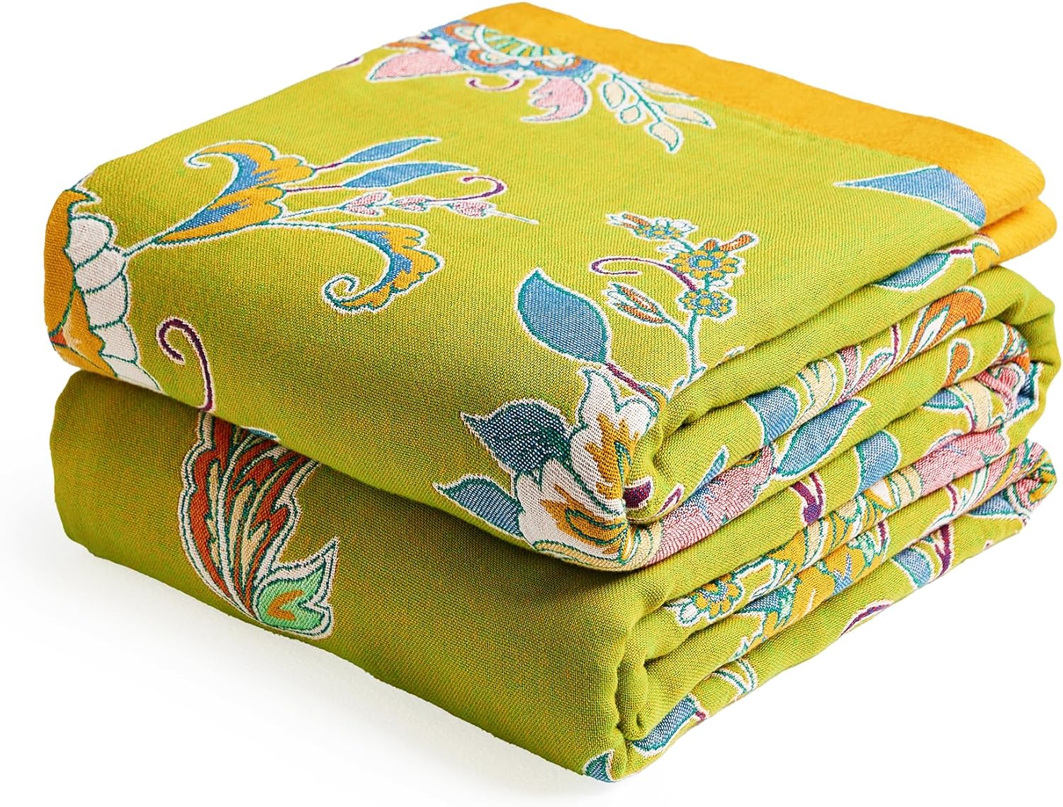 Boho Throw Blanket 80" x 90", 100% Organic Cotton Breathable Ultra Soft Bed Quilt Throw - All Season Luxury Floral Farmhouse Decor Blanket for Sofa Couch Chair and Gift. Green/Blue