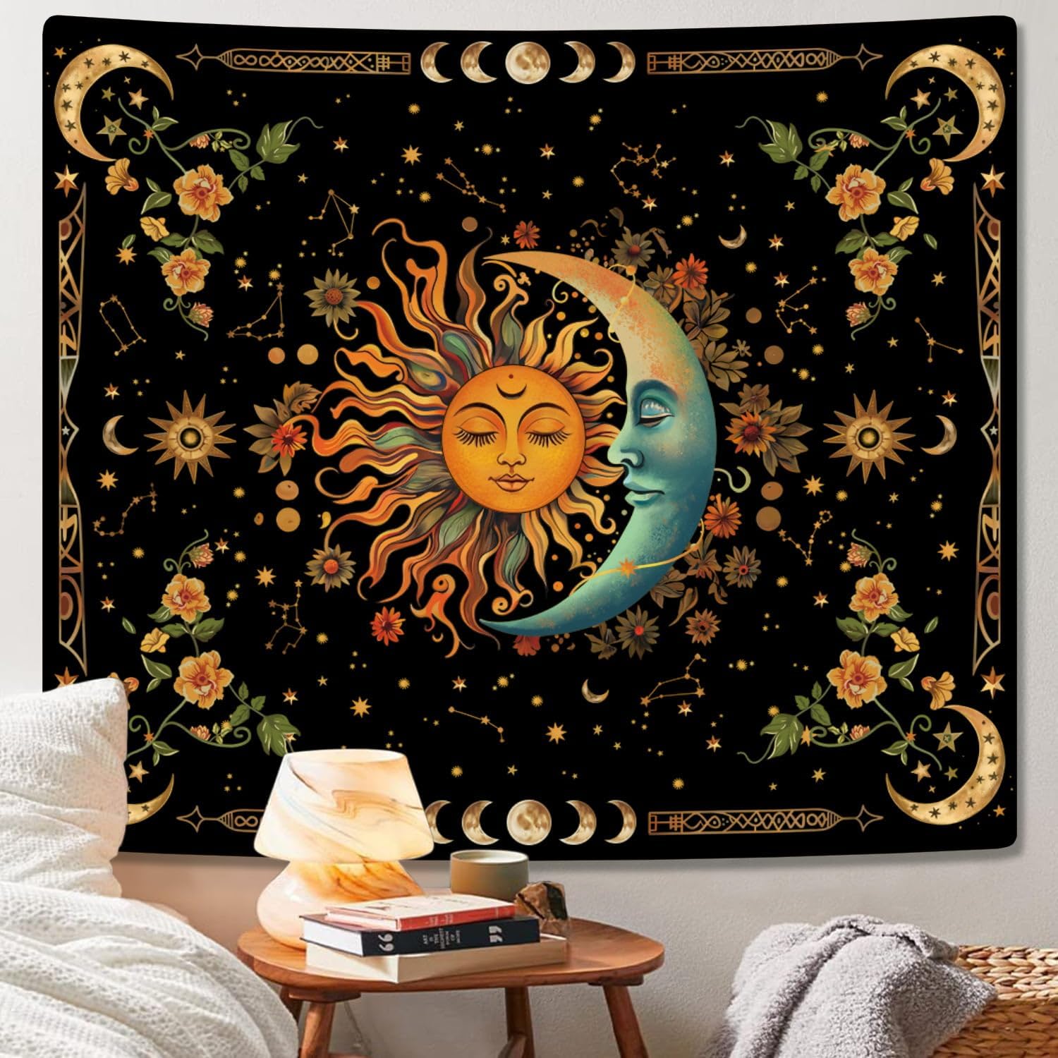ARTCREATOR Sun and Moon Tapestry Astrology Space Wall Hanging Boho Hippie Floral Plant Tapestries Aesthetic Vintage Mandala Flower Decor for Living Room Bedroom (29" x 37")