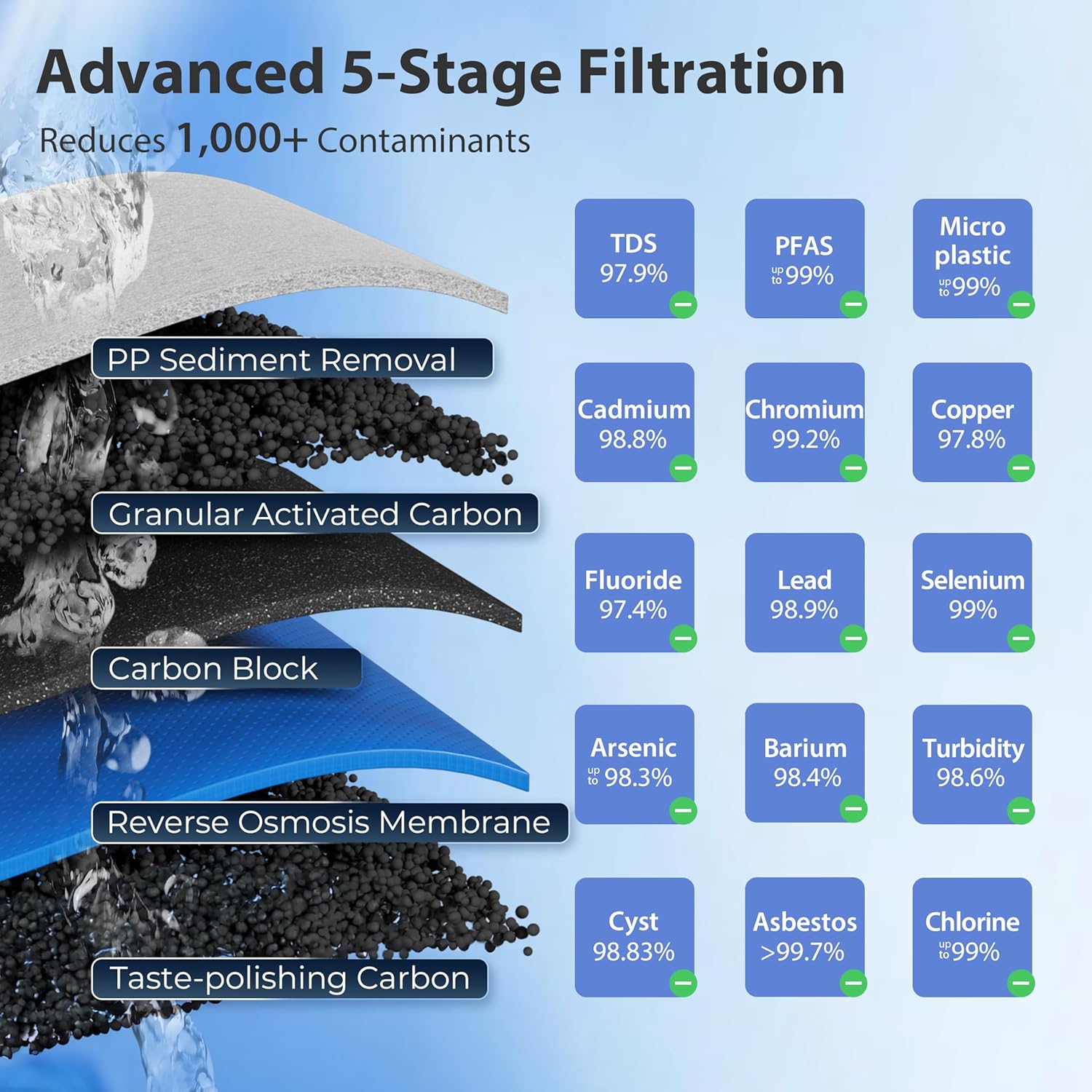 - EFFECTIVE FILTRATION - Reduces TDS, PFAS, chlorine, asbestos, barium, cadmium, chromium, copper, fluoride, lead, selenium, and over 1,000 other contaminants.