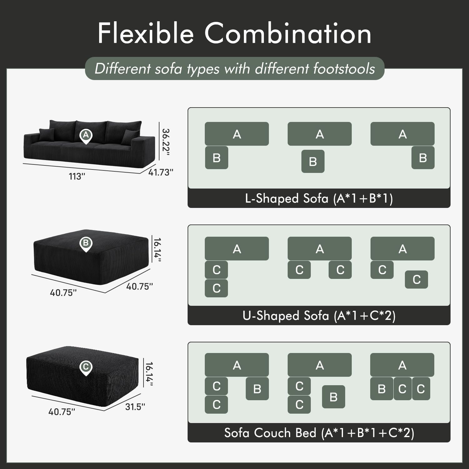Boneless Sectional Cloud Couch Sofa Bed for Living Room, 112" Modular Modern Lounge 3 Seater Sleeper Black Couches with Chaise, No Assemble, Cordury Compression Upholstered Sofas