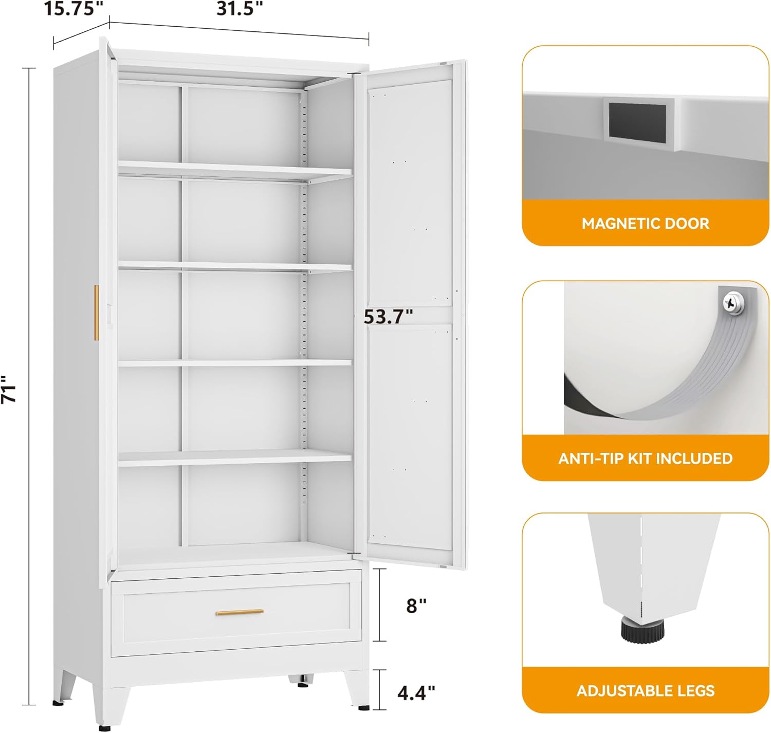 71 "Farmhouse Metal Filing Cabinet with a Drawer and 4 Adjustable Shelves, with 2 Large barn Door White Kitchen Cabinets, Metal Food Cabinets for Home, Kitchen, Dining/Living Room (White)