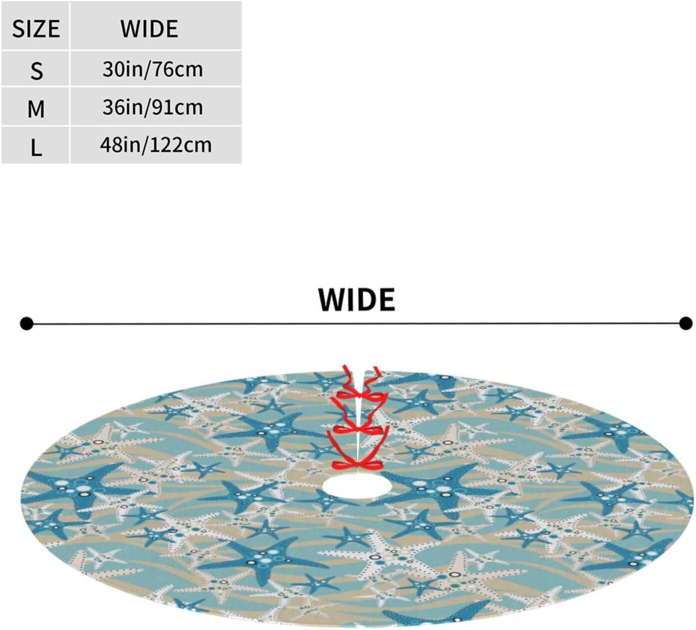 - Beach Tree skirt is measuring 30" , this tree skirt is perfect for any sized Christmas tree.Put it on the bottom of the tree, it can be a nice gift for your family and friends.In addition, the Christmas tree skirt is perfect for hiding the tree frames and all the light ropes, covering up your tree stand to keep your floors clean from pine needles or tree sap and offering a place to prop presents