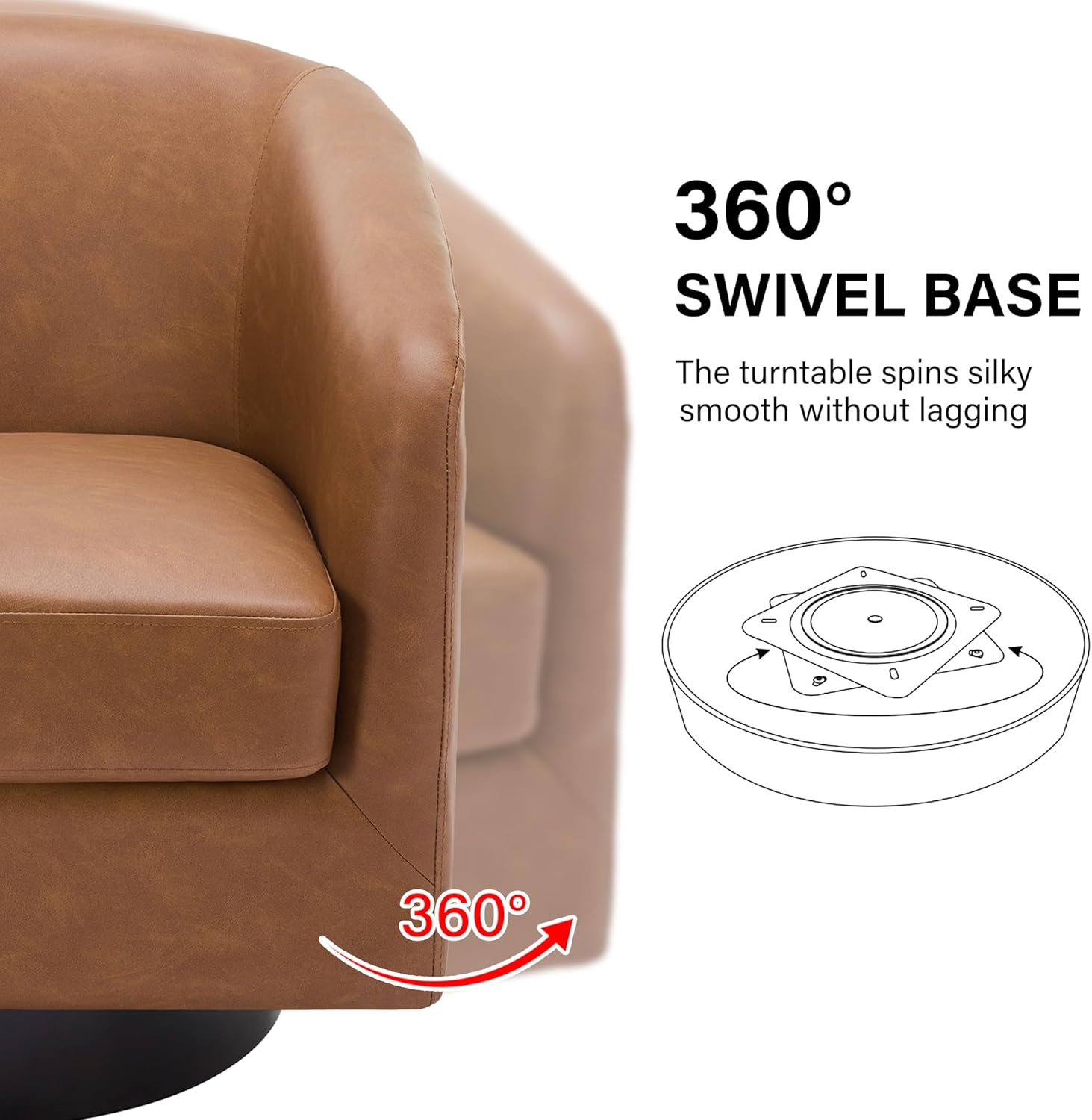 Swivel Barrel Accent Chair, Modern Round Faux Leather Arm Chair for Living Room, Bedroom, Comfy Club Reading Chairs for Adults-Faux Leather, Brown, Set of 1