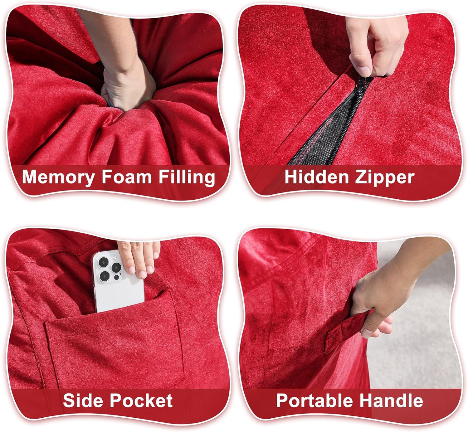 - Convenient Design: Our adult bean bag chair is designed with handle so you can move the giant bean bag chair wherever you want. The adult bean bag chair has a medium sized pocket on the side to store your phone, remote control, books and some small items. With the hidden zipper, you can remove the bean bag cover and throw it in the washing machine for cleaning.