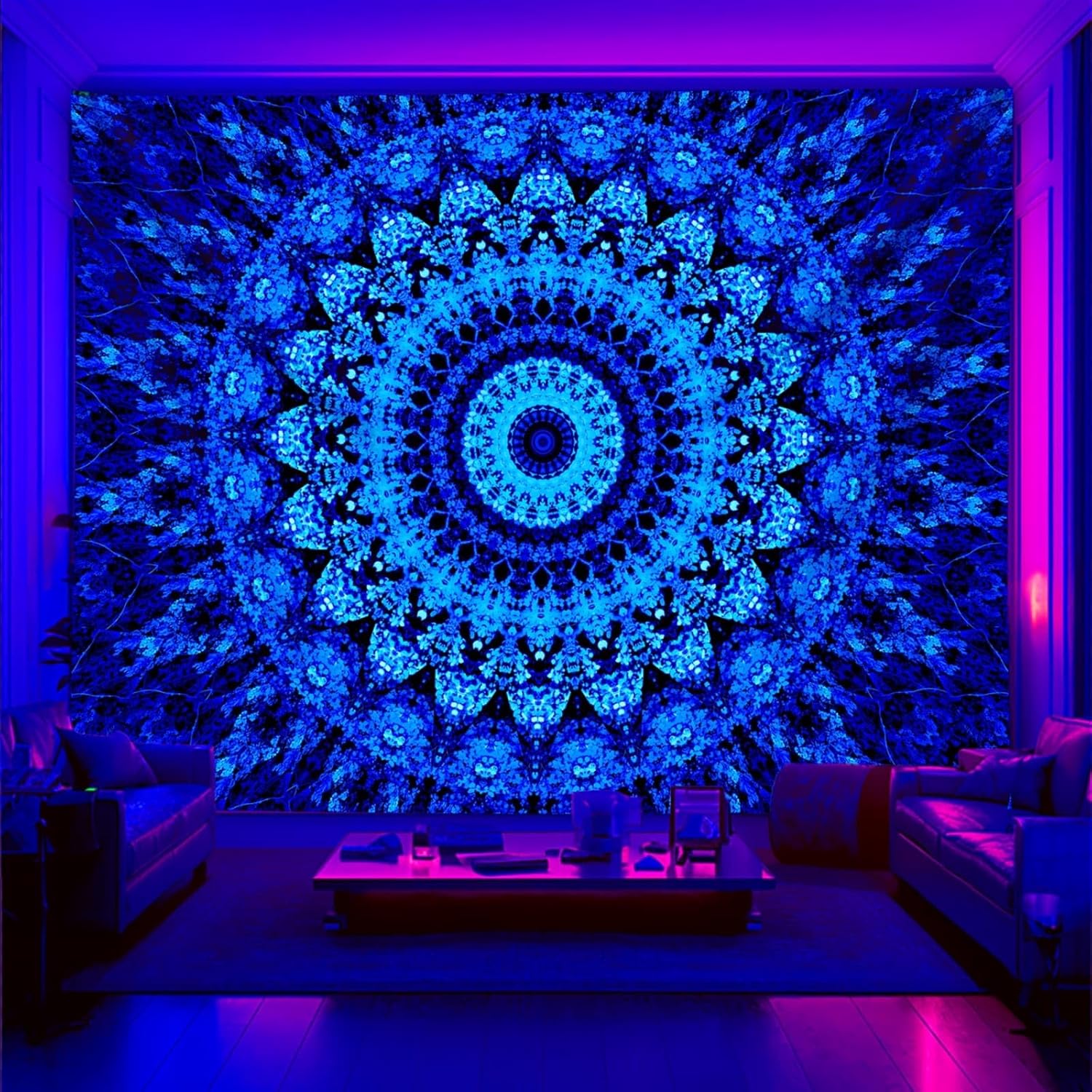 PSYHILAR Blacklight Mandala Tapestry for Bedroom, Black Light Posters for Adults and Teens, Neon UV Reactive Aesthetic Bohemian Wall Art Décor (90 x 70 Inches)