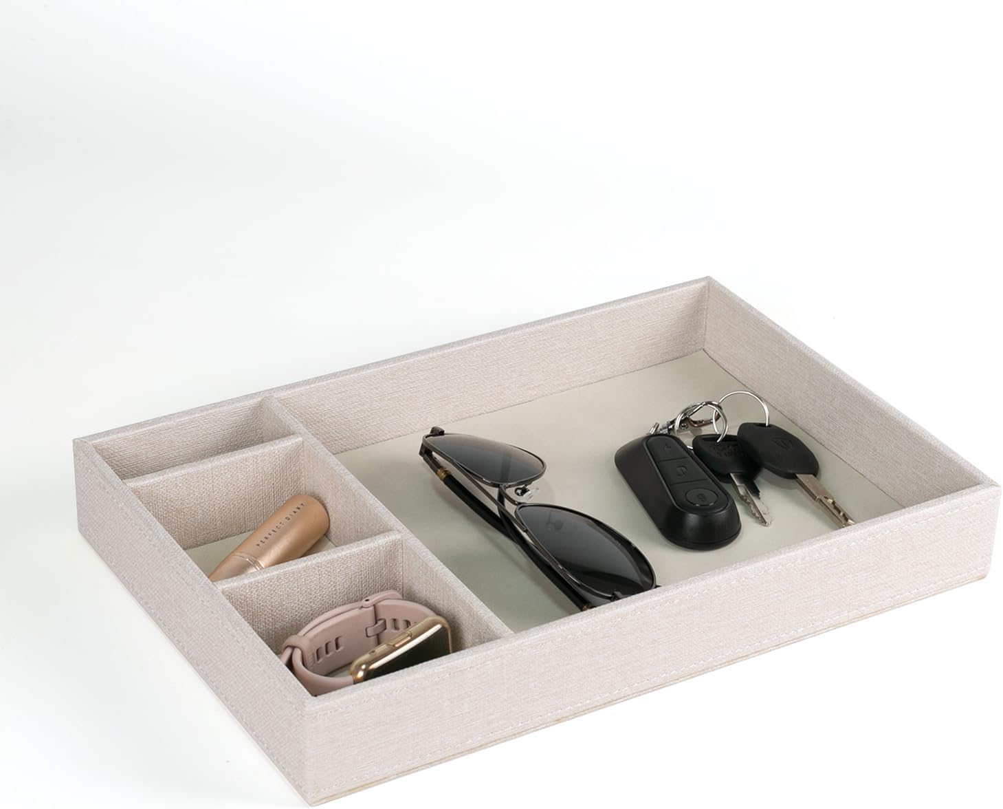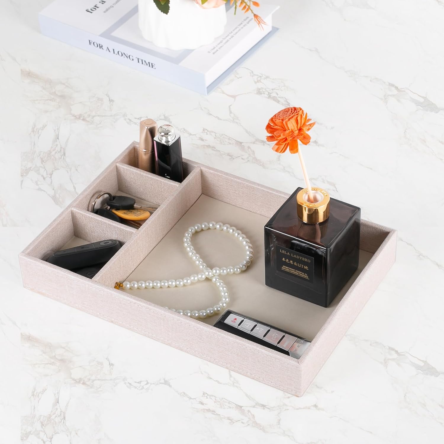 Desktop Storage Organizer, Nightstand or Dresser Organizer, Valet Tray, Entry Table Organizer, 4 Compartments,PU Leather Drawer Storage Organizer Decorative Trays. (Pearl White—2)