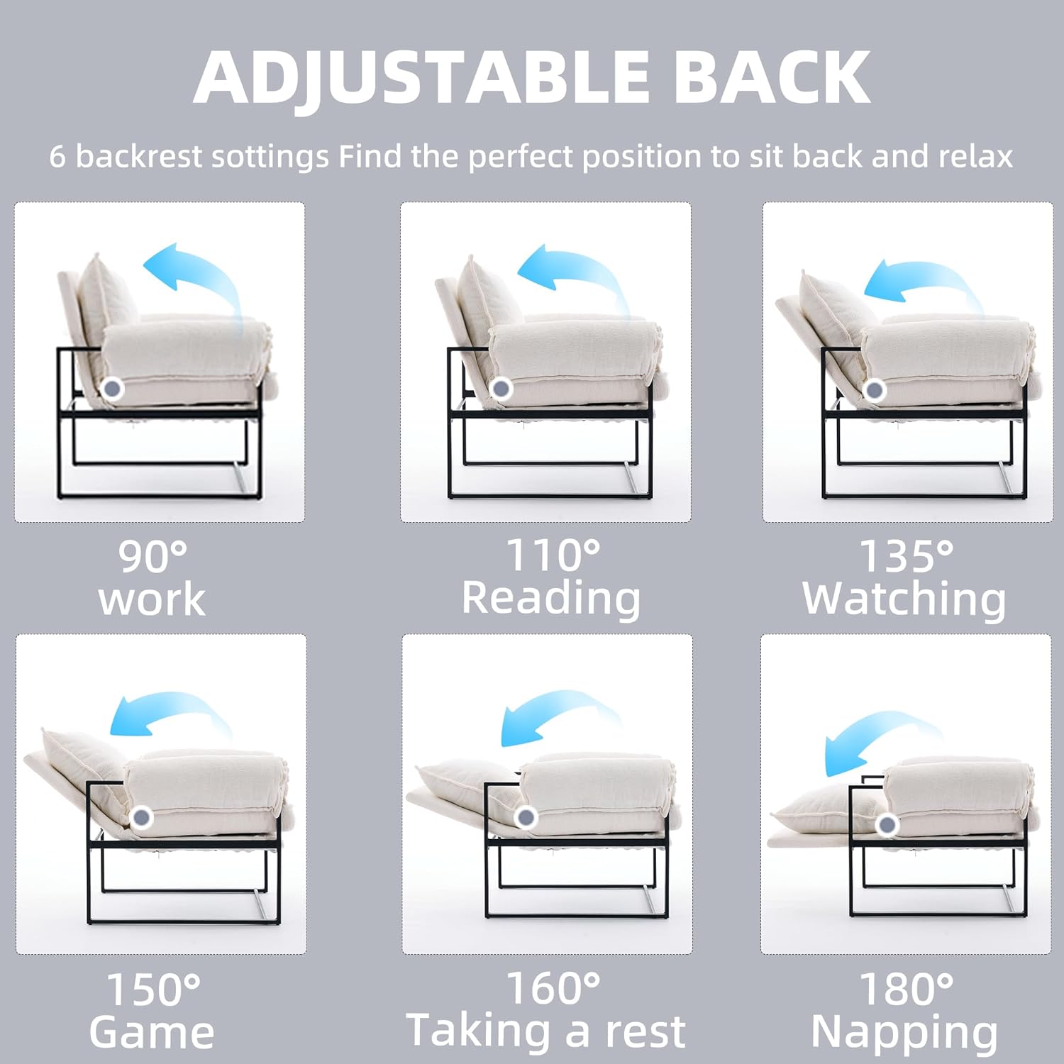 YISHENG Accent Chair with 6-Angle Adjustable Backrest, Chenille Fabric Living Room Chair Upholstered Lounge Chair, Modern Chair Cozy Reclining Chair for Reading Room, 1PC White