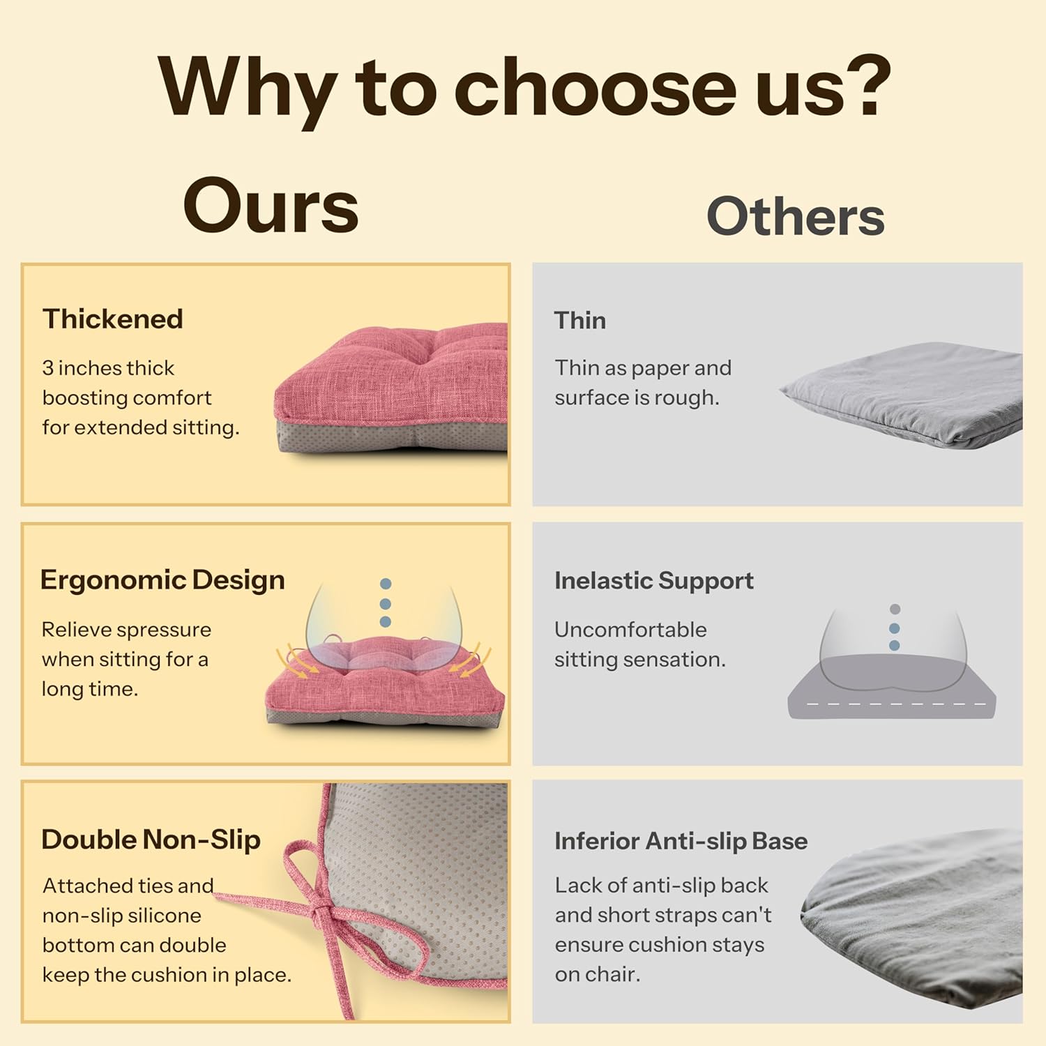 - Enhanced Support & Premium Filling: Our dining room chair cushions offer double the comfort with high quality cotton filling that offers superior comfort and support, relieving pressure on your hips and tailbone during extended seating. The chair cushions are tufted to prevent foam clumping. Perfect for extended sitting whether at the desk or dining table it combines comfort with ergonomic support.