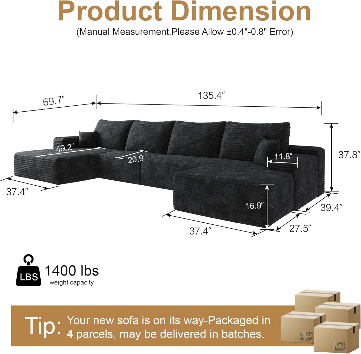 136" Sectional Couches for Living Room Modern Modular Sofa with L-Shape Couchs Upholstered Boneless Couch Deep Seat Sectional Couch with Chaise (Black, Left Facing Chaise+3Seaters+Ottoman)