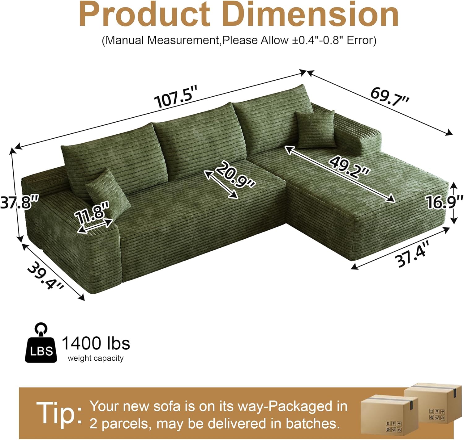 108" Sectional Couches for Living Room Modern Modular Sofa with L-Shape Couchs Upholstered Boneless Couch Deep Seat Sectional Couch with Chaise (Green, Right Facing Chaise+2Seaters)