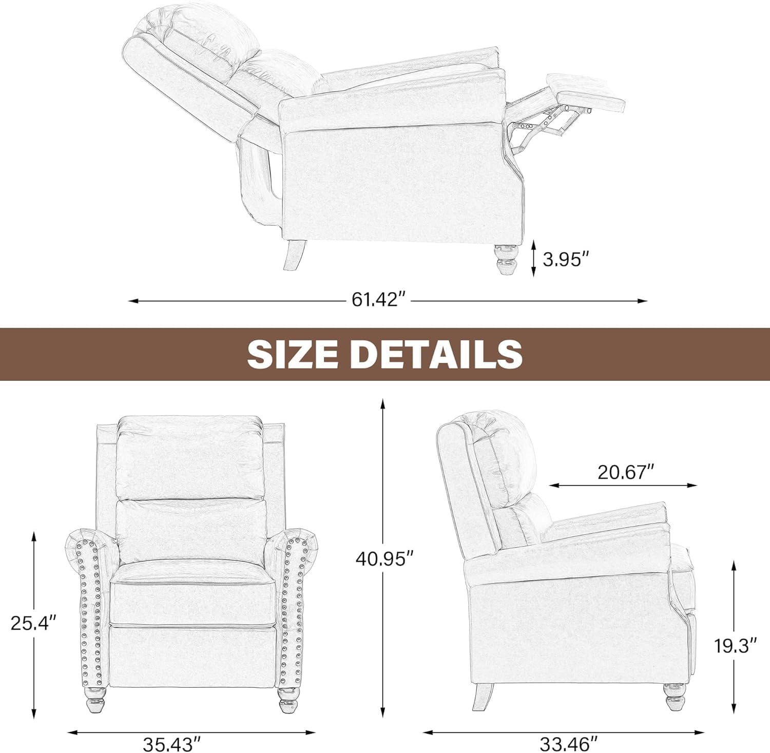 - Suitable Dimensions, Application Scenario - Kindly please confirm the size before buying. This recliner chair measures at 35"W X 33"D X 41"H, Seat Dimensions - 22"W x 20.5"D x 19"H. The minimalist and generous appearance can add more vitality to your room and is ideal for waiting room, living room, bedroom, vanity room, dressing room, office, reception.