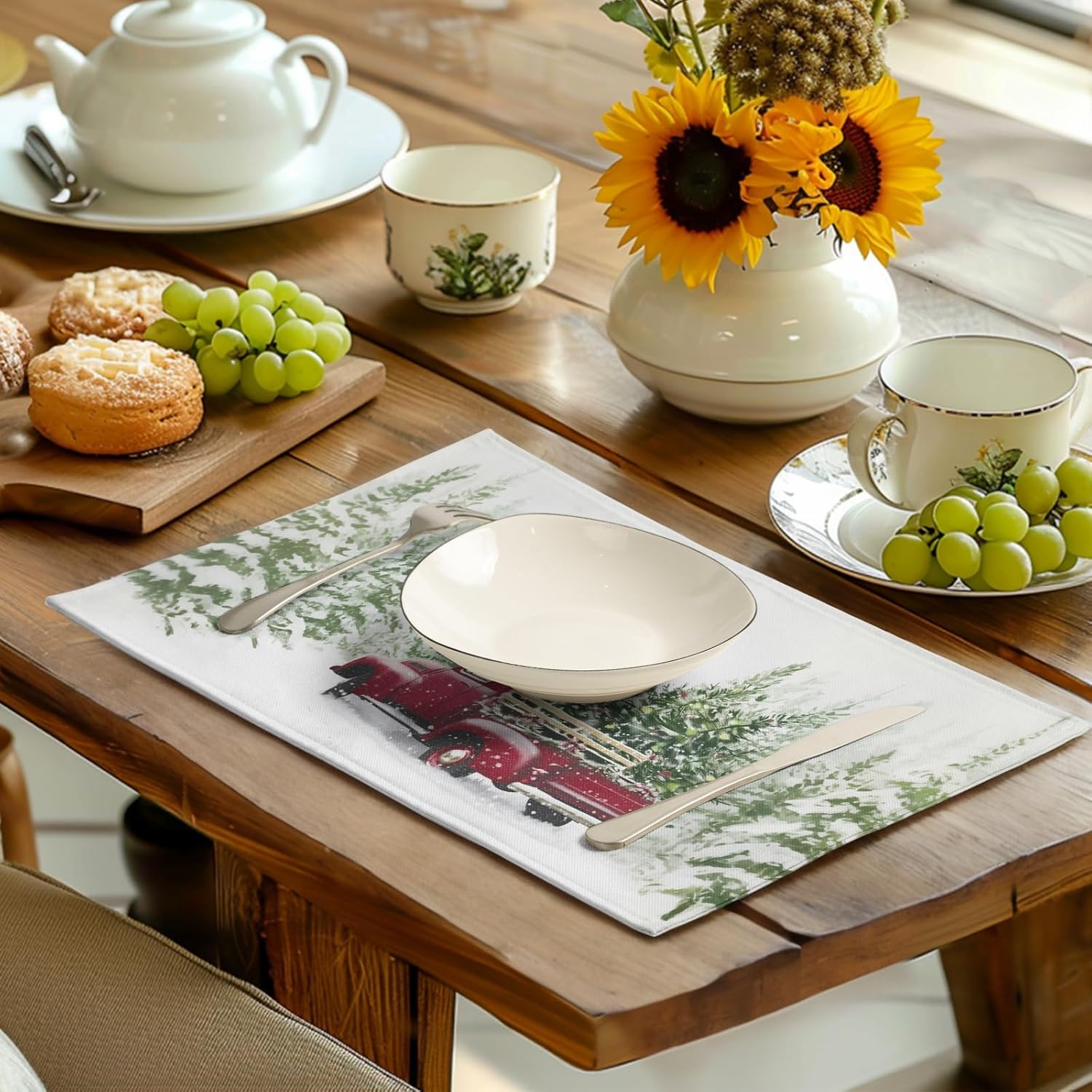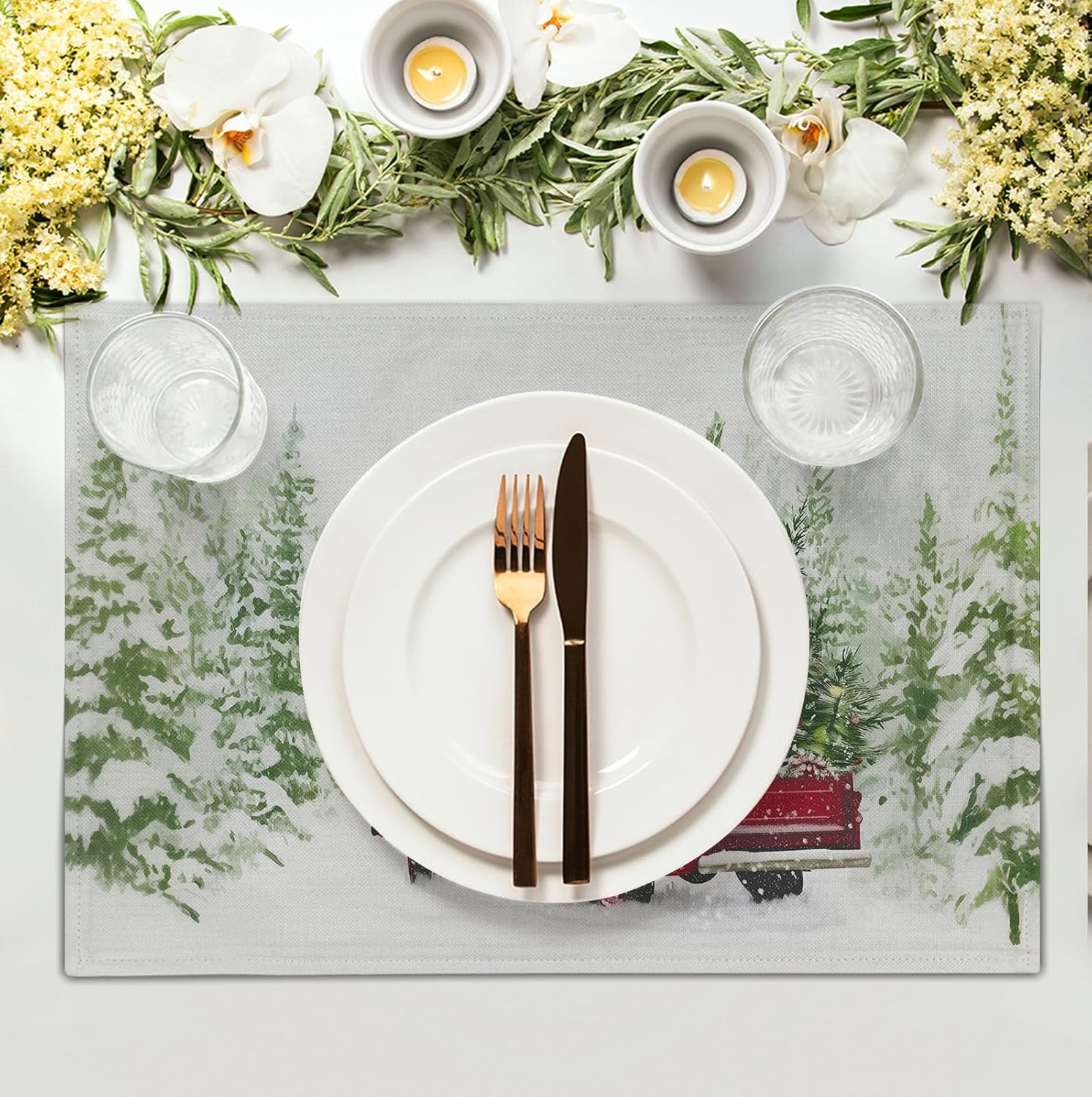 - TABLE DECORATION: Christmas holiday placemats feature high-definition printing technology for crisp, clear patterns and vibrant colors; rectangle placemats with a red truck and pine tree pattern; unique and eye-catching seasonal patterns add charm to farmhouse table place mats, creating a winter and Christmas atmosphere for your party