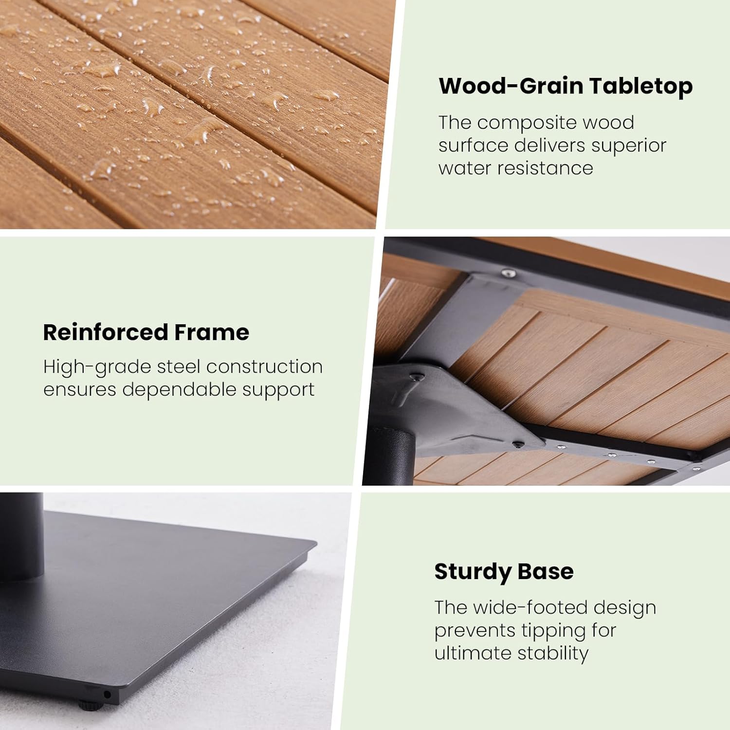 - 【WOOD-LOOK OUTDOOR TABLETOP】: This outdoor table features a realistic wood-look surface, offering the timeless beauty of natural wood without the maintenance. Crafted from durable, weather-resistant materials, the table mimics the warmth and texture of wood while being highly resistant to the elements, including sun, rain, and humidity.