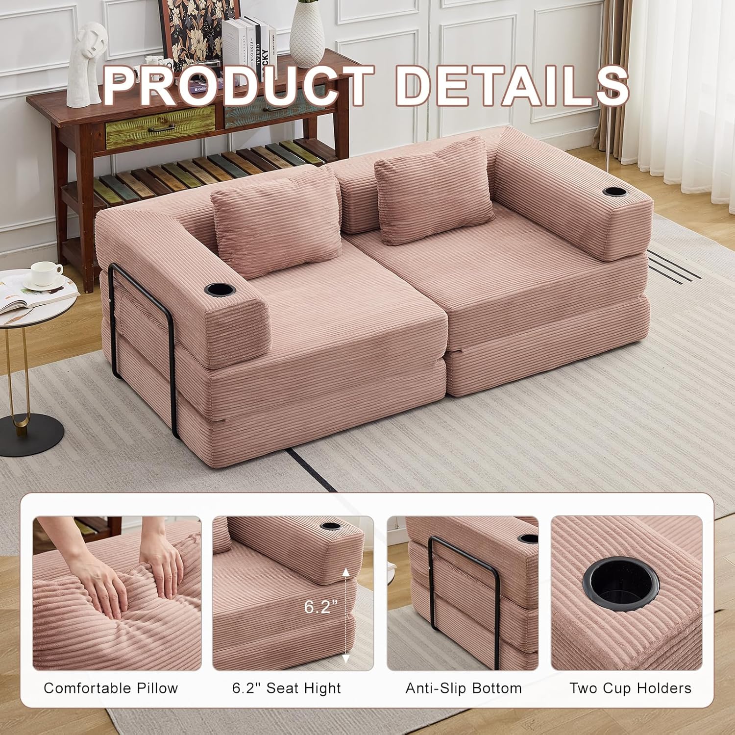 - 【Spacious & Comfortable Dimensions】Loveseat Sofa size: 78.75"L x 39.37"W x 15.75"H. This modular floor sleeper sofa is ideal for lounging, napping, reading, or accommodating overnight guests — a space-saving solution for apartments, living rooms, and studios.