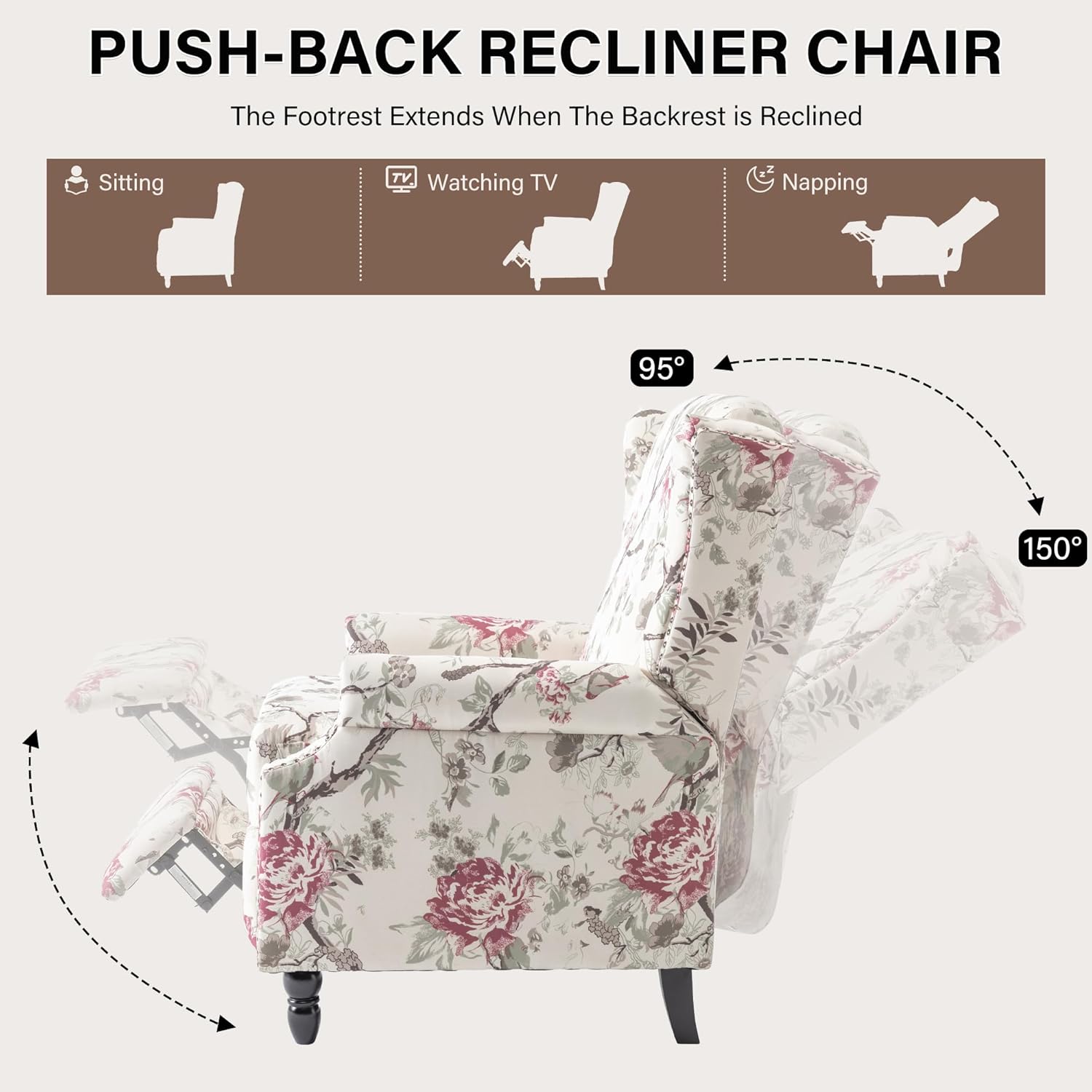 - Adjustable Upholstered Backrest - Recliner Back Adjust to Any Angle for You Need(95°-150°). You can flexible use in 3 modes to meet your demand: sit, recline and lie flat. Cooperating with the padded footrest to meet your different needs, like reading a book, watching TV, going to bed, or getting up for leaving. With simple act increase your overall comfort!