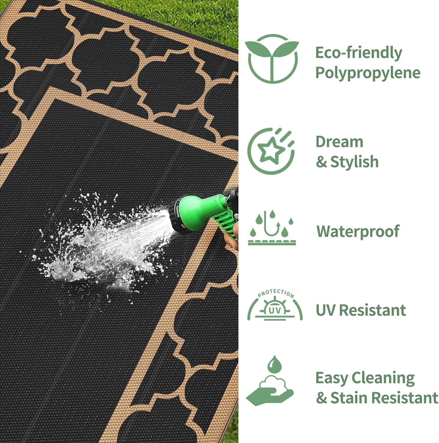 GENIMO Outdoor Rug Waterproof for Patio Decor, 6'x9' Reversible Plastic Straw Rug Carpet, Camping Mats for Outdoor, RV, Backyard, Deck, Balcony, Picnic, Black & Grey