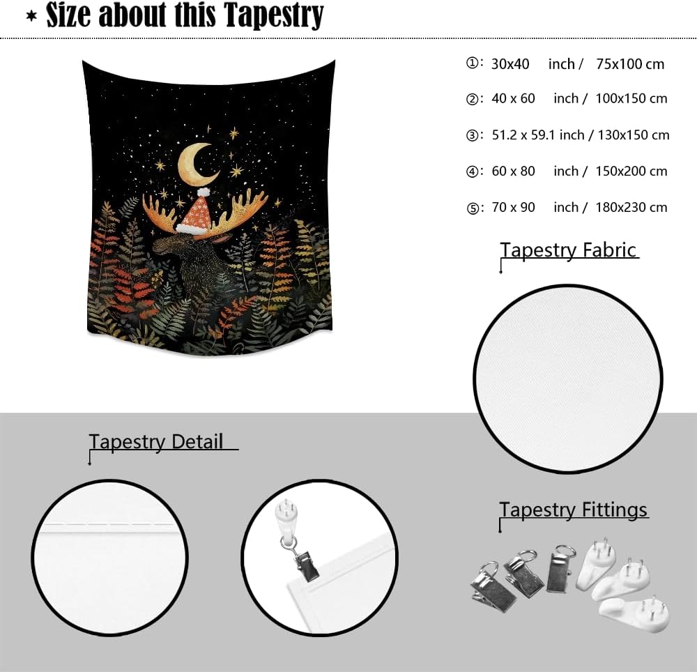Cute Moose Tapestry Winter Christmas Aesthetic Wall Hanging Decor Funny Animal Lover Gift Whimsical Christmas Tapestries for Nursery Kids Bedroom Home Living Room Decoration 40x60inch
