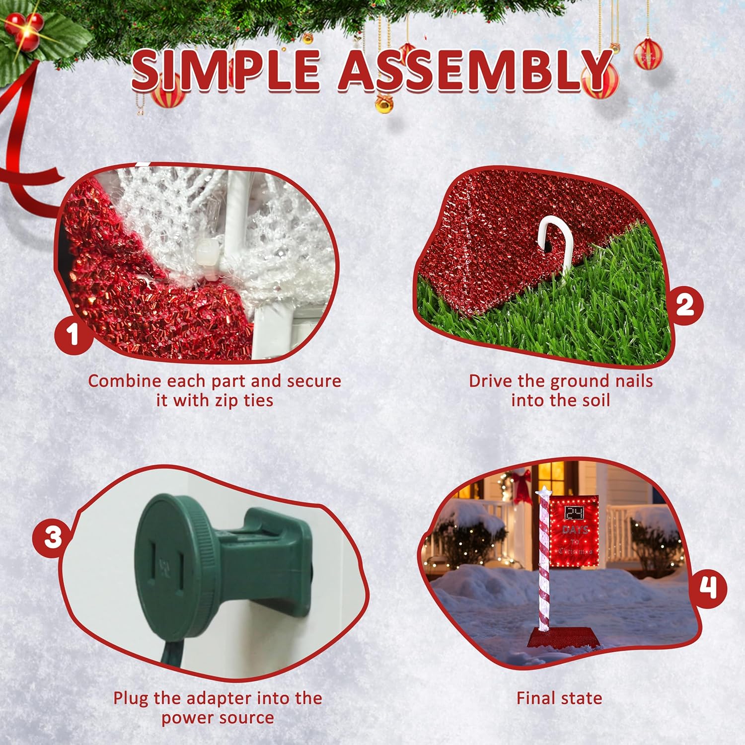 - LED Lights: The pre-lit Christmas countdown sign is installed with dense 125 LED lights beads which make it sparkles cool white in the sun and night. Light up your front yard, make you become the focus of your neighbors