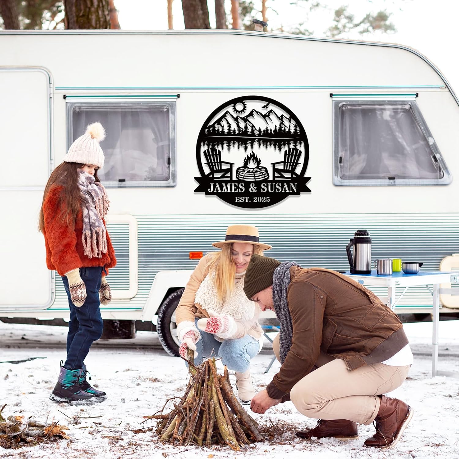 - Family Name Sign Personalized: Add your name or date to this family name sign personalized for outdoor use, creating a unique outdoor family name sign that highlights your love for camping and makes a welcoming addition to patios, porches, or fire pit areas.