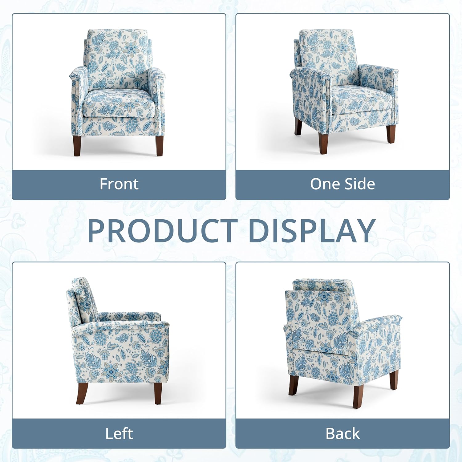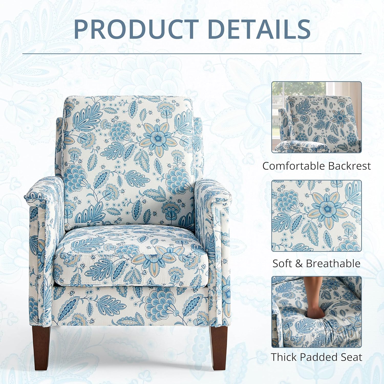 Floral Accent Chair, High Back Upholstered Armchair with Solid Wooden Legs, Padded Armrest and Removable Comfortable Cushioned Seat Single Sofa for Living Room, Bedroom, Blue