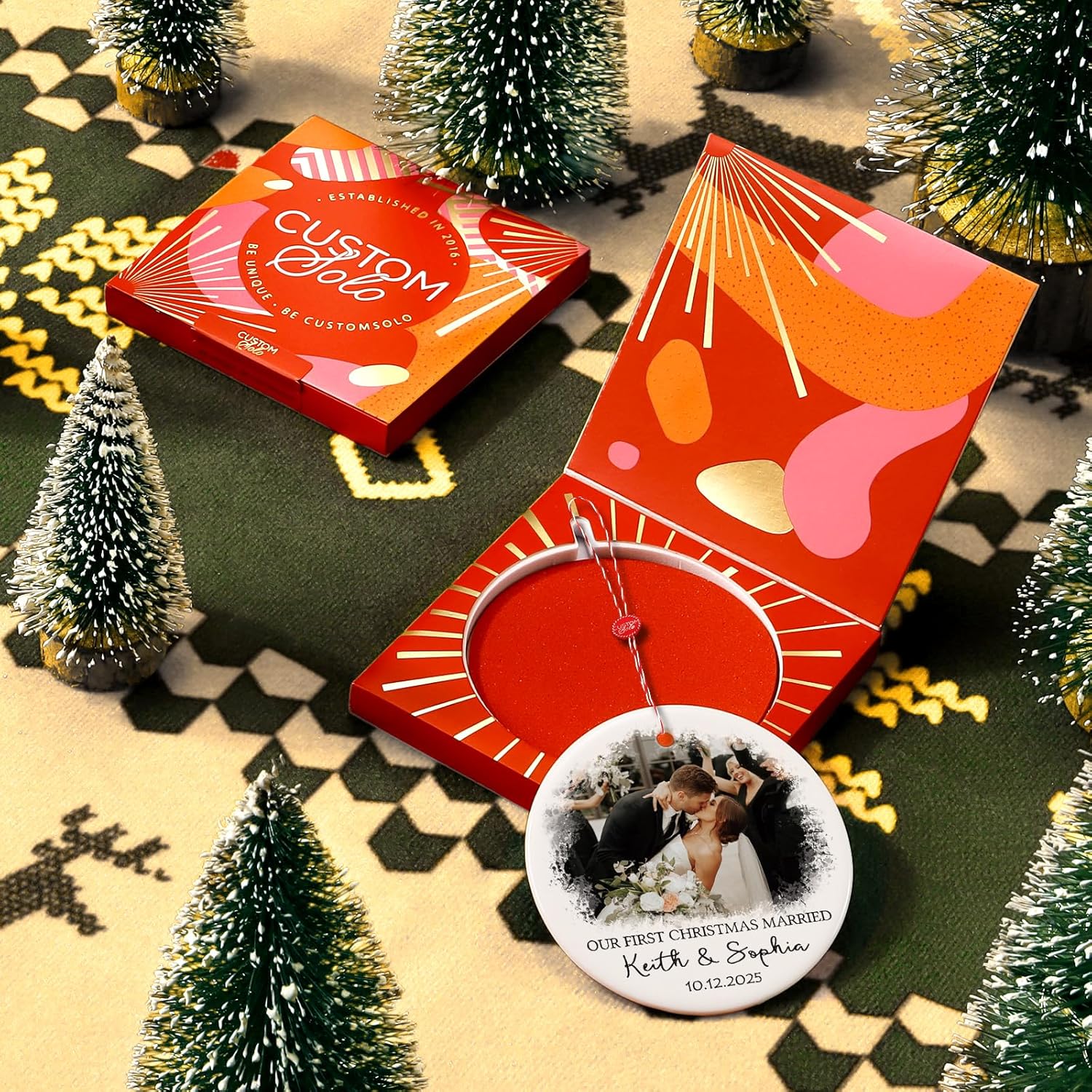 - ๐ High Quality Ceramic ๐ This first christmas married ornament is made of high-quality ceramic. Unlike wooden ornaments, this premium ceramic features a smooth, glossy finish, looks sleek and high-end. the custom ornaments features vibrant, high-definition printing that resists fadingโensuring your cherished memories remain vivid for years to come. Perfect for commemorating your unforgettable first Christmas together as a married couple. Available in 3 sizes (3", 4", 5")