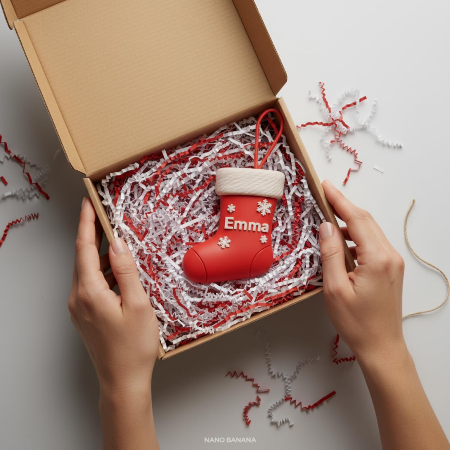 - Your custom ornament is just a few clicks away! Each stocking comes complete with a durable red ribbon loop, so it's ready to hang on your tree the moment it arrives. We are a US-based small business (如果适用) dedicated to quality and customer satisfaction. Order with confidence knowing you're getting a beautiful, ready-to-display product backed by dedicated support.